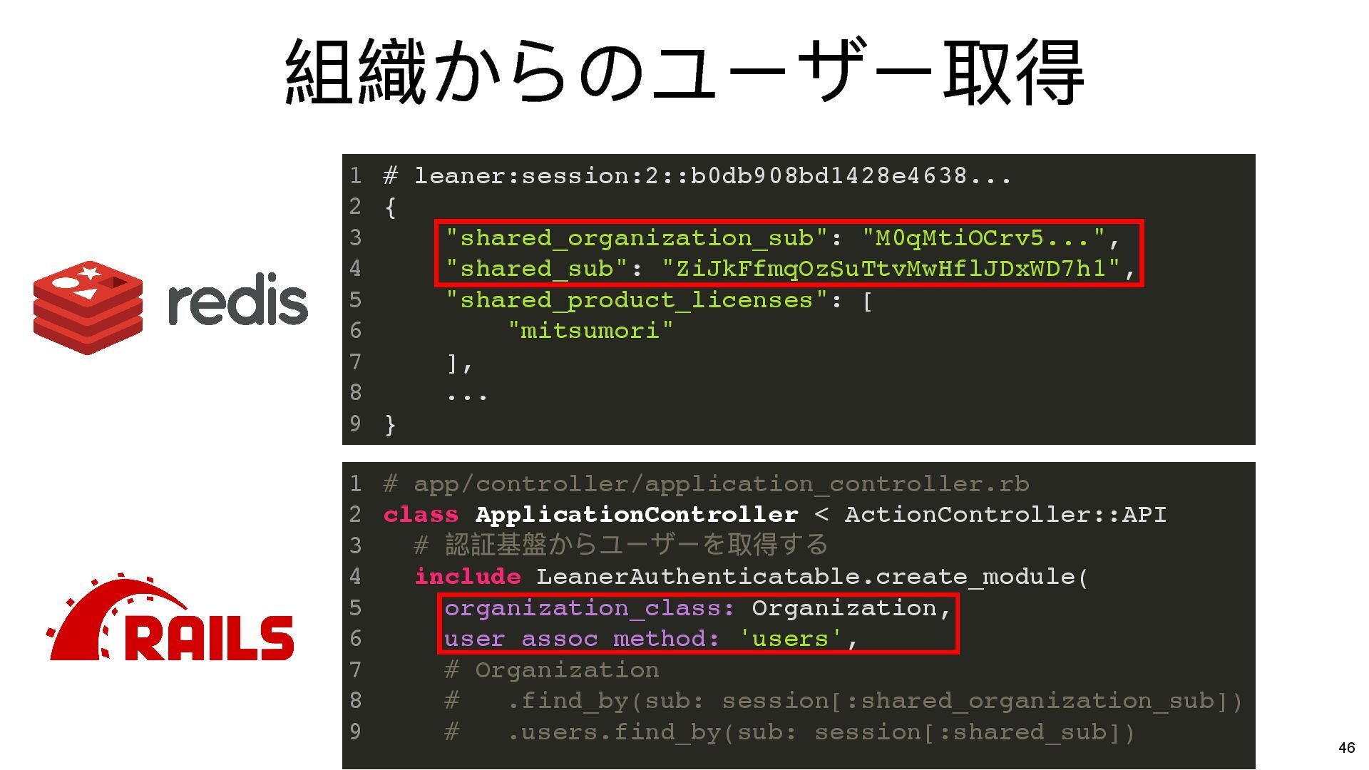 LeanerAuthenticatable.create_module( organization_class: Organization, user_assoc_method: 'users', # Organization # .find_by(sub: session[:shared_organization_sub]) # .users.find_by(sub: session[:shared_sub]) 1 2 3 4 5 6 7 8 9 # leaner:session:2::b0db908bd1428e4638... { "shared_organization_sub": "M0qMtiOCrv5...", "shared_sub": "ZiJkFfmqOzSuTtvMwHflJDxWD7h1", "shared_product_licenses": [ "mitsumori" ], ... } 1 2 3 4 5 6 7 8 9 46