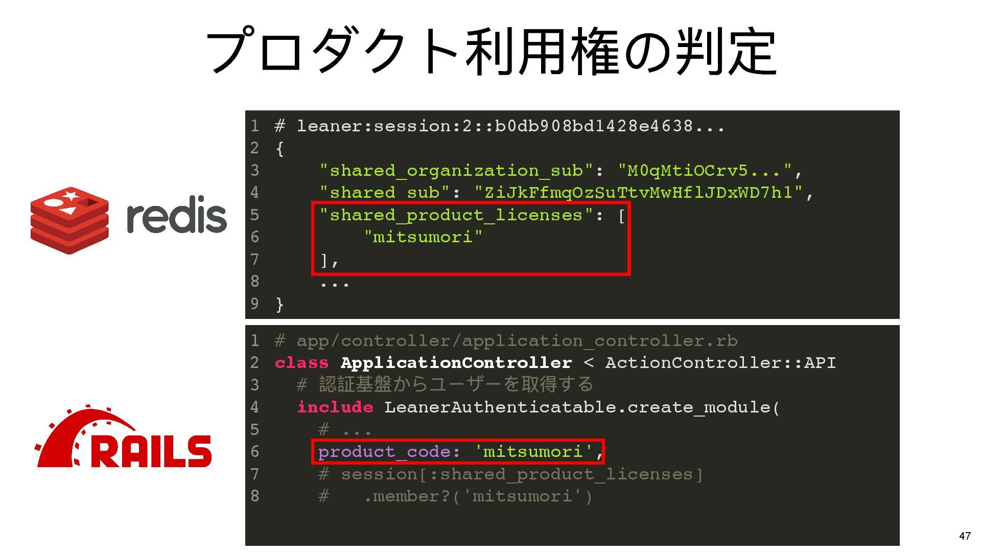 LeanerAuthenticatable.create_module( # ... product_code: 'mitsumori', # session[:shared_product_licenses] # .member?('mitsumori') 1 2 3 4 5 6 7 8 # leaner:session:2::b0db908bd1428e4638... { "shared_organization_sub": "M0qMtiOCrv5...", "shared_sub": "ZiJkFfmqOzSuTtvMwHflJDxWD7h1", "shared_product_licenses": [ "mitsumori" ], ... } 1 2 3 4 5 6 7 8 9 47
