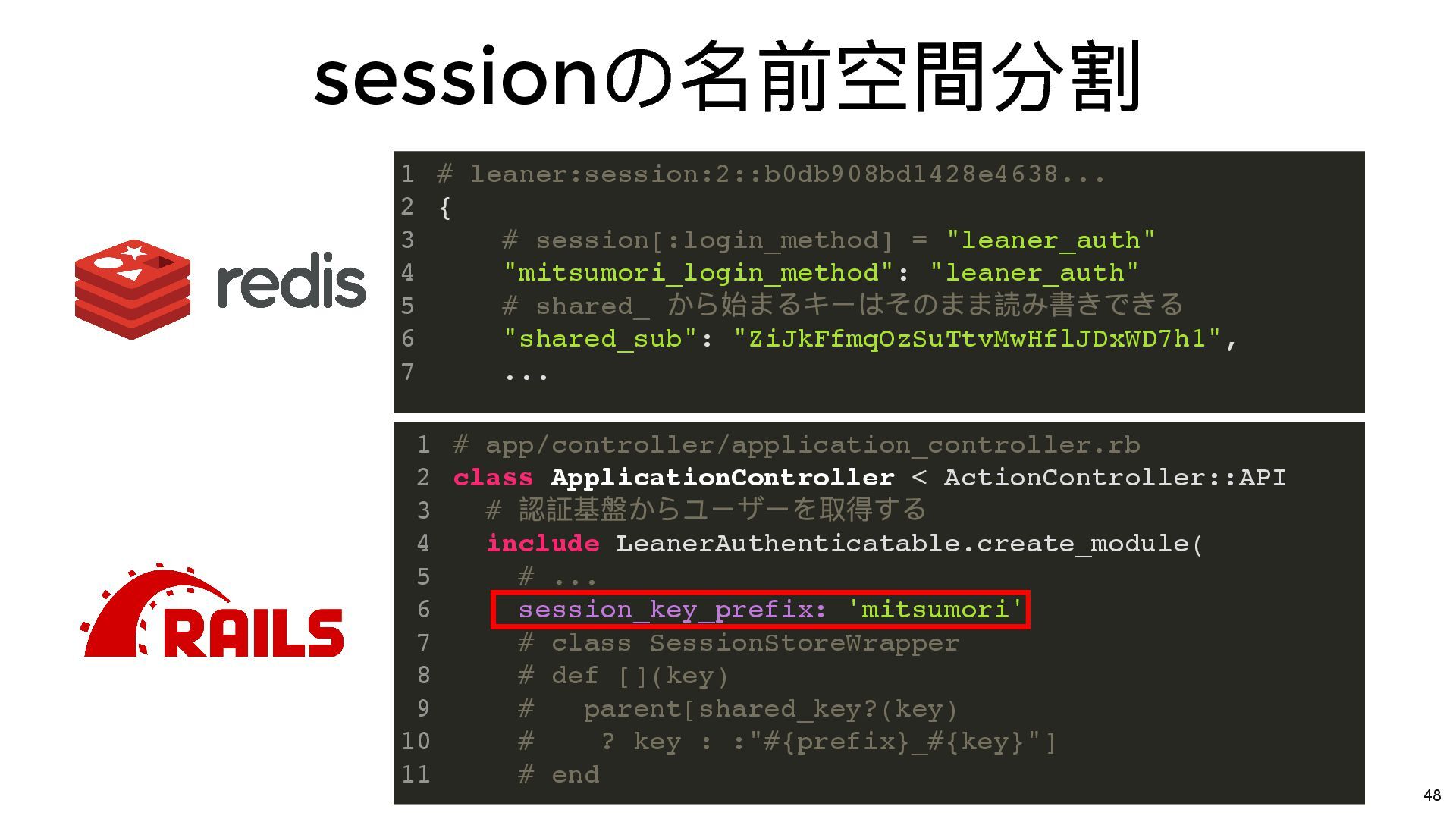 include LeanerAuthenticatable.create_module( # ... session_key_prefix: 'mitsumori' # class SessionStoreWrapper # def [](key) # parent[shared_key?(key) # ? key : :"#{prefix}_#{key}"] # end 1 2 3 4 5 6 7 8 9 10 11 # leaner:session:2::b0db908bd1428e4638... { # session[:login_method] = "leaner_auth" "mitsumori_login_method": "leaner_auth" # shared_ から始まるキーはそのまま読み書きできる "shared_sub": "ZiJkFfmqOzSuTtvMwHflJDxWD7h1", ... 1 2 3 4 5 6 7 48