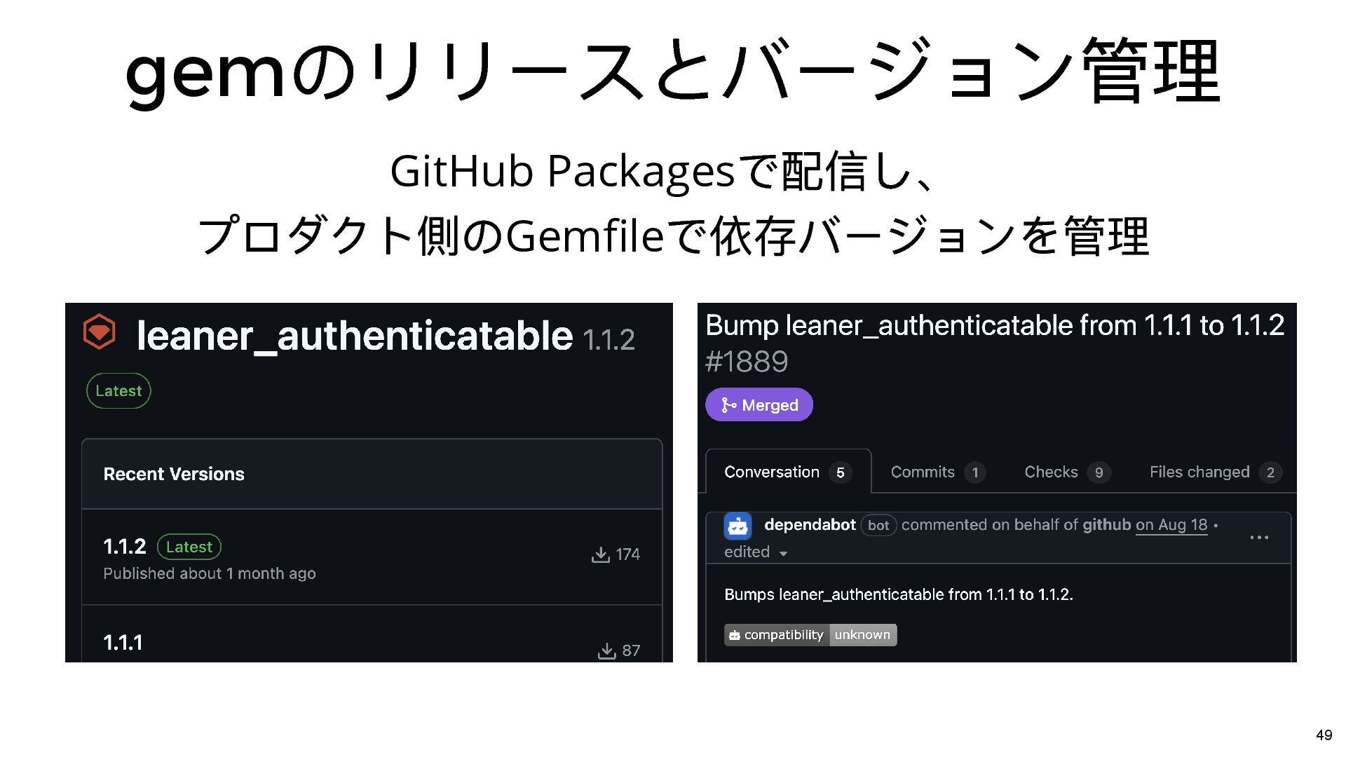 gem のリリースとバージョン管理 GitHub Packages で配信し、 プロダクト側のGemfile で依存バージョンを管理 49