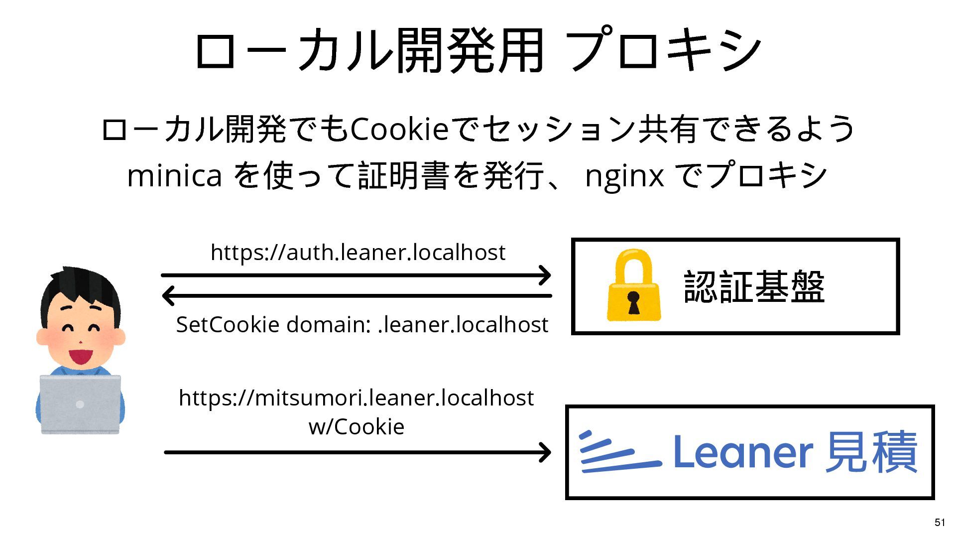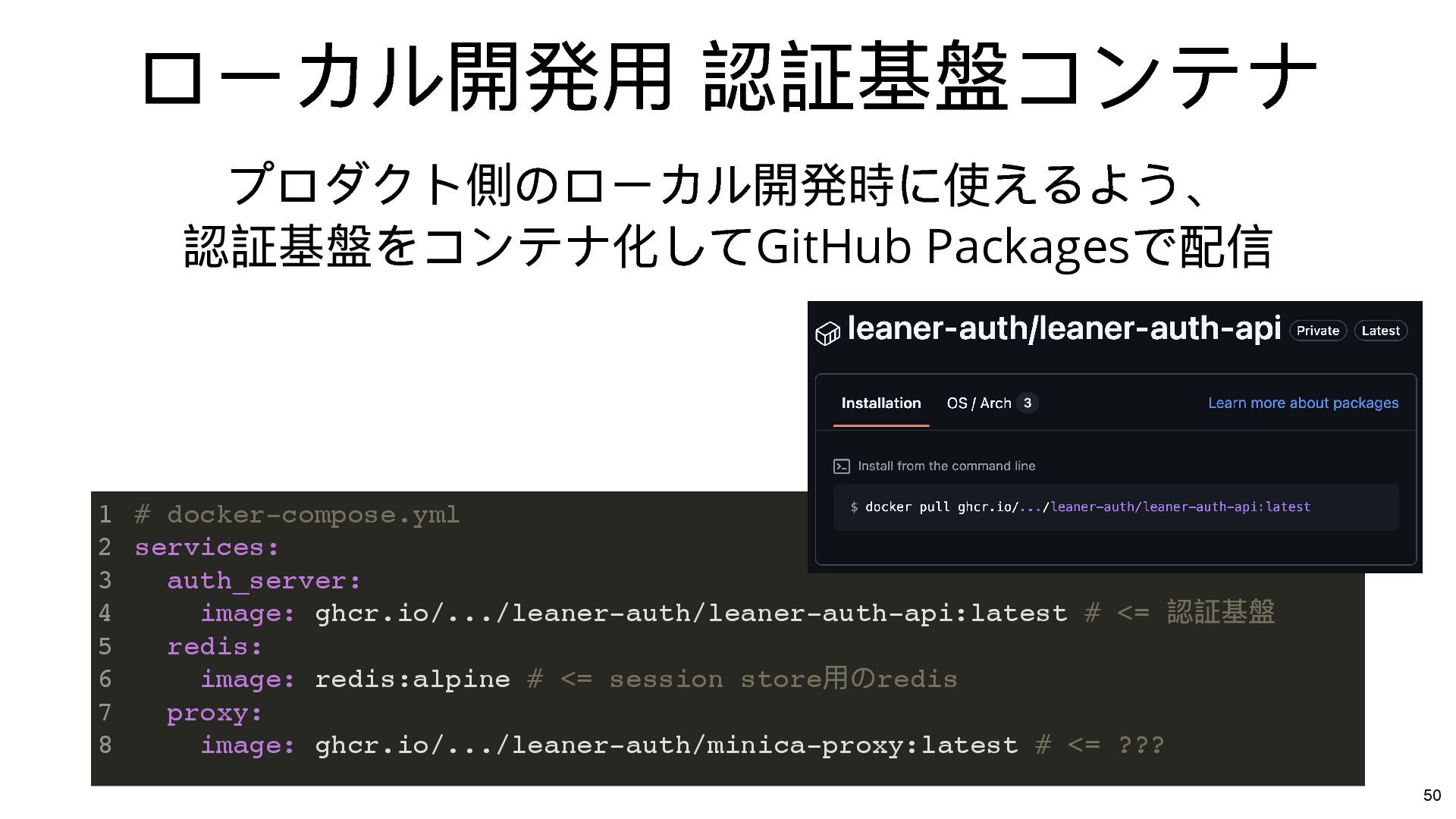 image: redis:alpine # <= session store ⽤のredis proxy: image: ghcr.io/.../leaner-auth/minica-proxy:latest # <= ??? 1 2 3 4 5 6 7 8 ローカル開発⽤ 認証基盤コンテナ プロダクト側のローカル開発時に使えるよう、 認証基盤をコンテナ化してGitHub Packages で配信 50