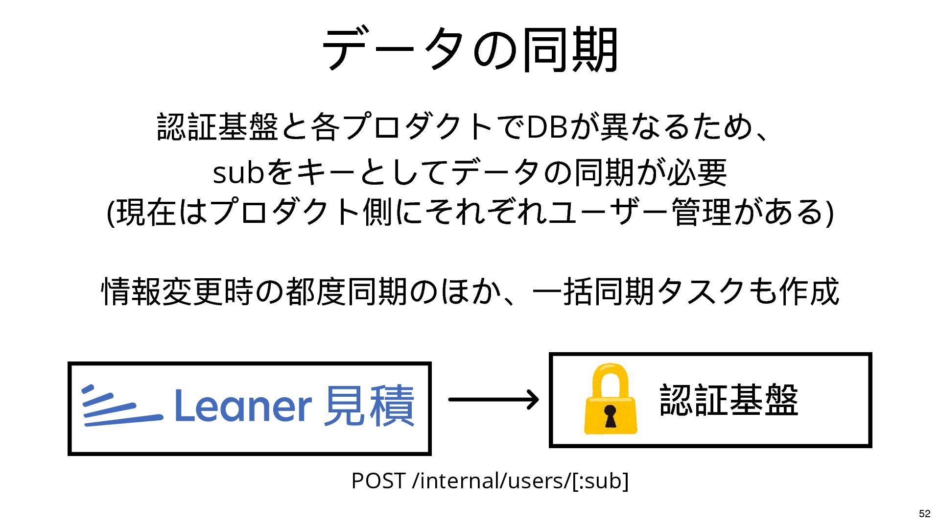 データの同期 認証基盤と各プロダクトでDB が異なるため、 sub をキーとしてデータの同期が必要 ( 現在はプロダクト側にそれぞれユーザー管理がある) 情報変更時の都度同期のほか、⼀括同期タスクも作成 認証基盤 POST