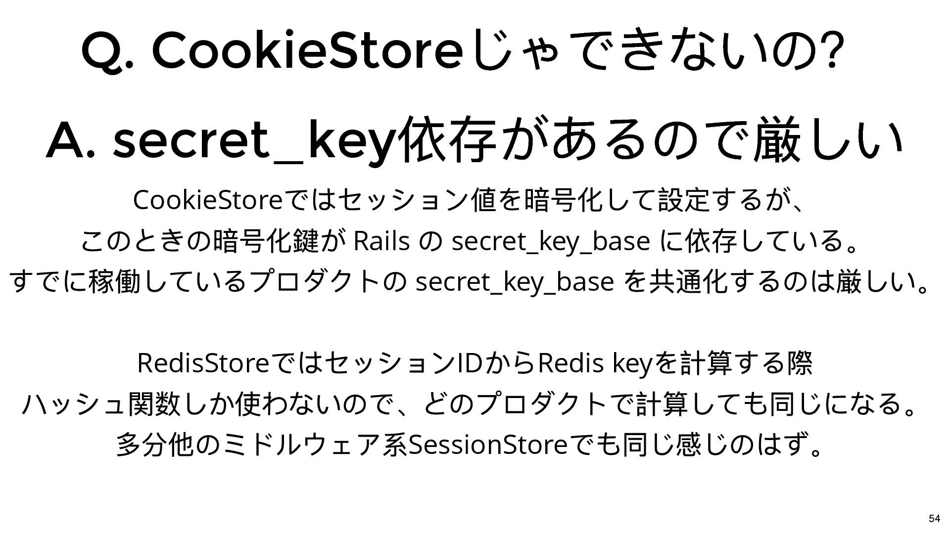 の secret_key_base に依存している。 すでに稼働しているプロダクトの secret_key_base を共通化するのは厳しい。 RedisStore ではセッションID からRedis key を計算する際 ハッシュ関数しか使わないので、どのプロダクトで計算しても同じになる。 多分他のミドルウェア系SessionStore でも同じ感じのはず。 54