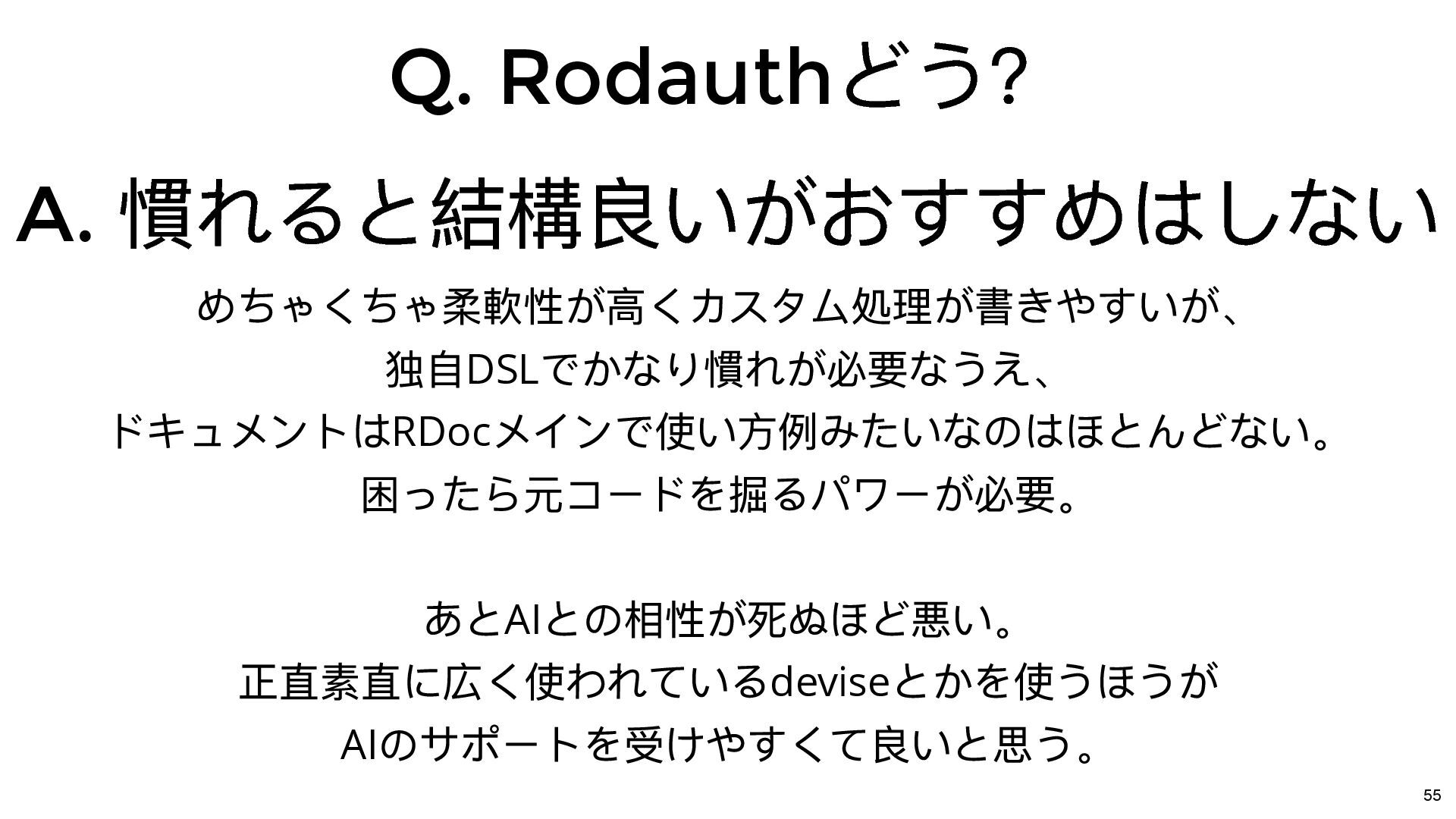 Q. Rodauth どう? A. 慣れると結構良いがおすすめはしない めちゃくちゃ柔軟性が⾼くカスタム処理が書きやすいが、 独⾃DSL でかなり慣れが必要なうえ、 ドキュメントはRDoc メインで使い⽅例みたいなのはほとんどない。