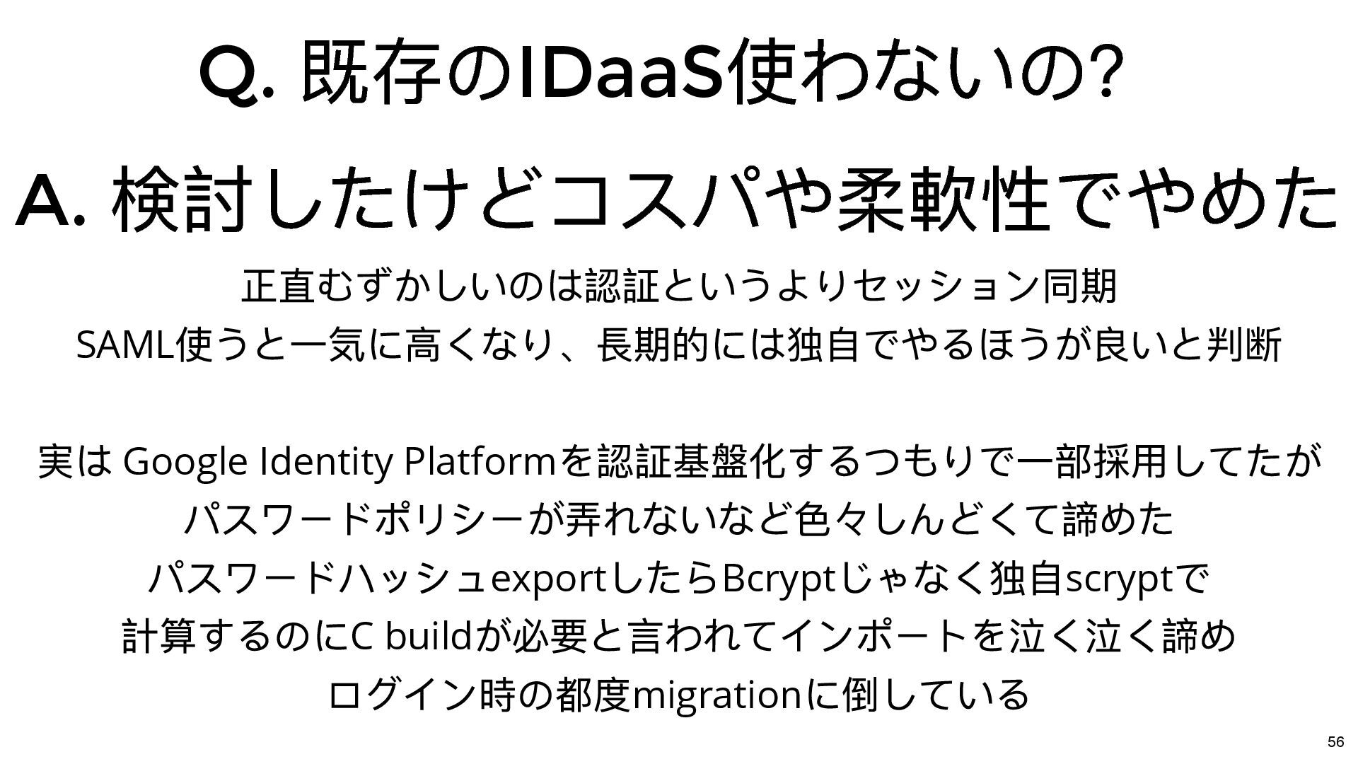 Identity Platform を認証基盤化するつもりで⼀部採⽤してたが パスワードポリシーが弄れないなど⾊々しんどくて諦めた パスワードハッシュexport したらBcrypt じゃなく独⾃scrypt で 計算するのにC build が必要と⾔われてインポートを泣く泣く諦め ログイン時の都度migration に倒している 56