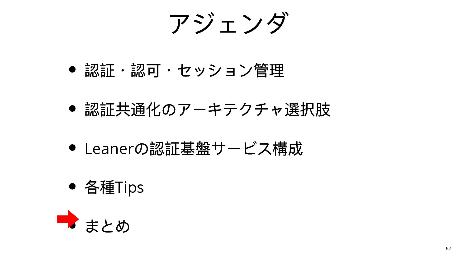 認証・認可・セッション管理 認証共通化のアーキテクチャ選択肢 Leaner の認証基盤サービス構成 各種Tips まとめ アジェンダ 57