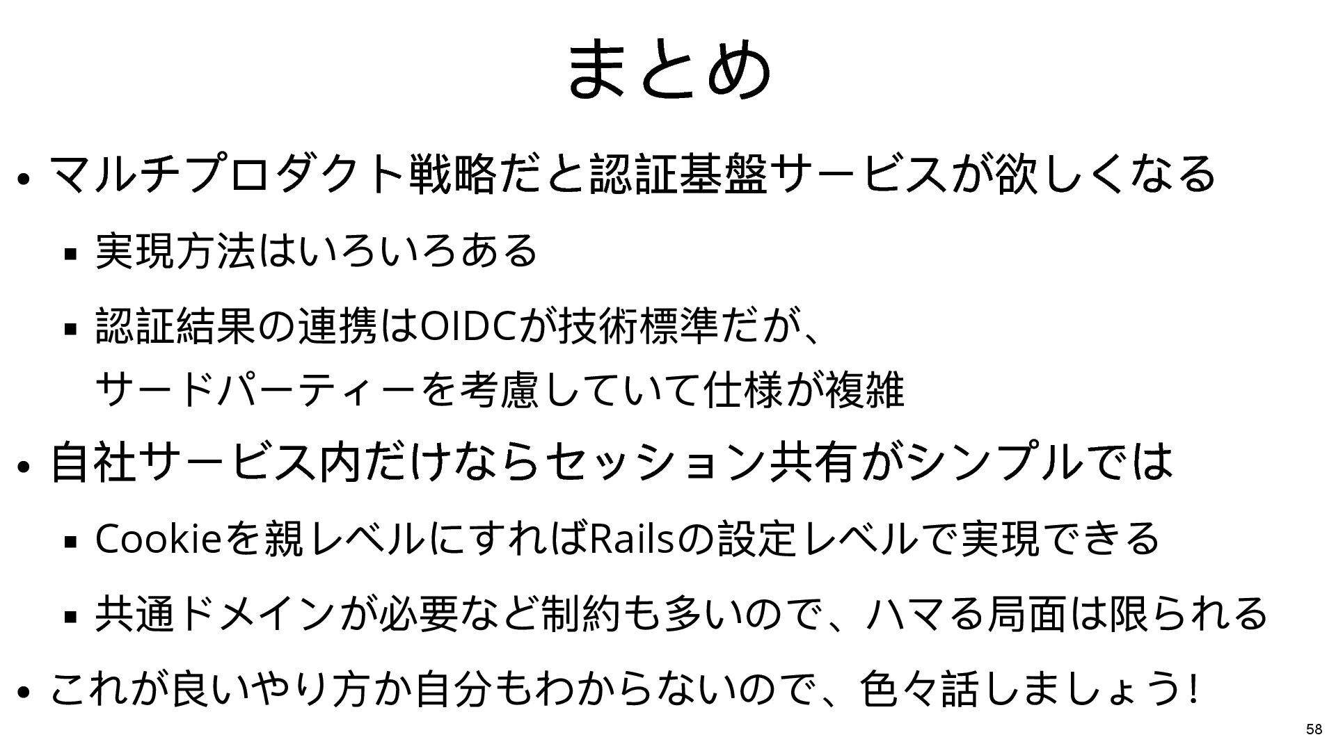 まとめ マルチプロダクト戦略だと認証基盤サービスが欲しくなる 実現⽅法はいろいろある 認証結果の連携はOIDC が技術標準だが、 サードパーティーを考慮していて仕様が複雑 ⾃社サービス内だけならセッション共有がシンプルでは Cookie を親レベルにすればRails の設定レベルで実現できる