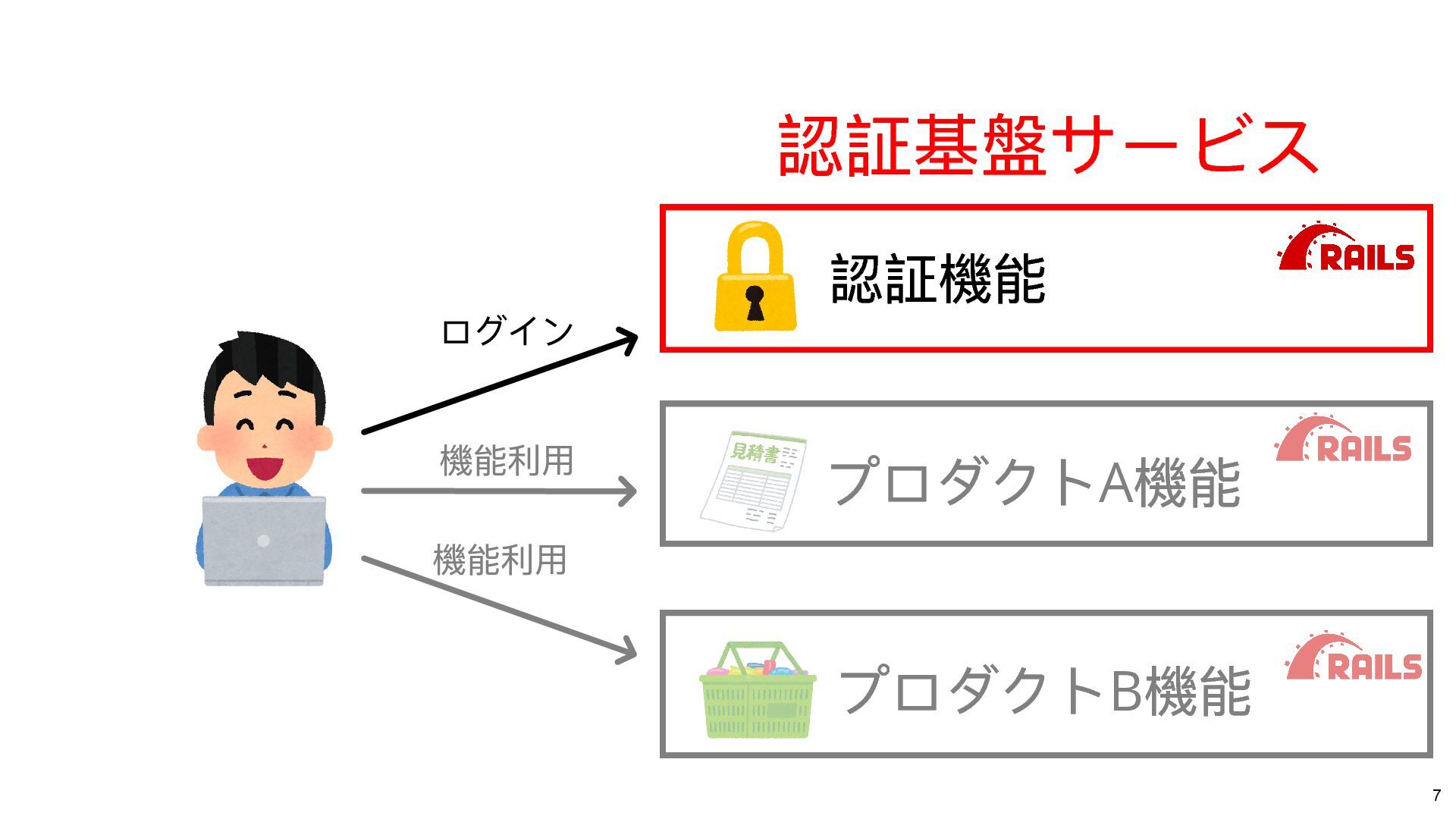 認証機能を単独のサービスに切り出す 認証機能 プロダクトB 機能 ログイン 機能利⽤ 機能利⽤ 6 プロダクトA 機能