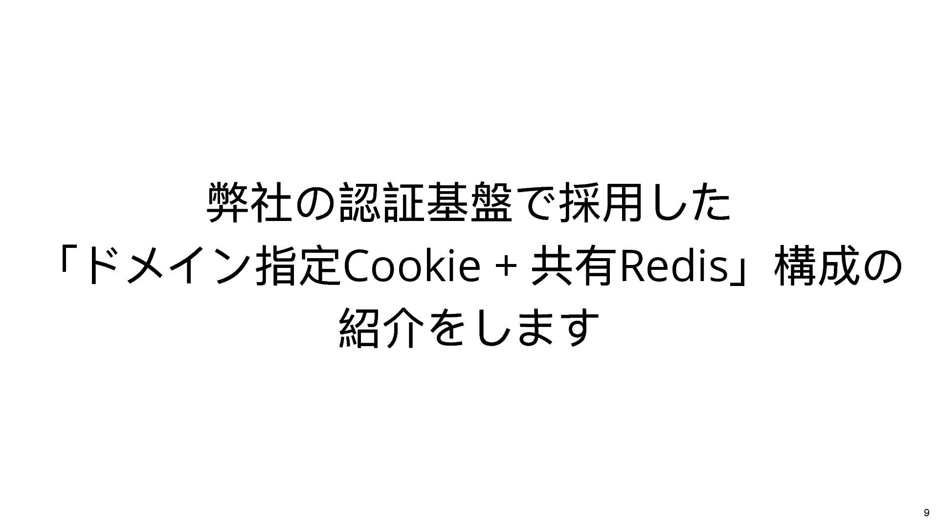 弊社の認証基盤で採⽤した 「ドメイン指定Cookie + 共有Redis 」構成の 紹介をします 9