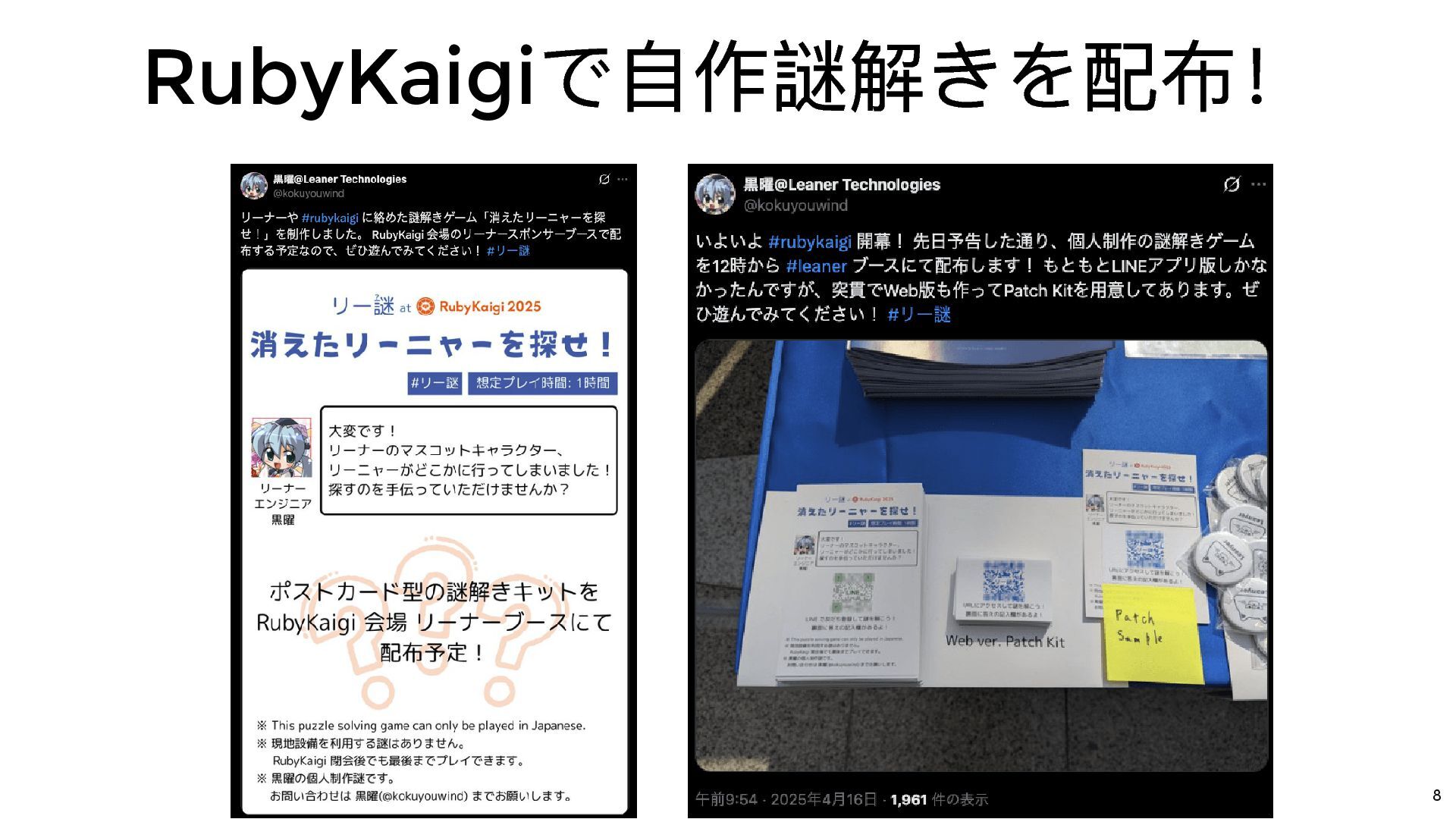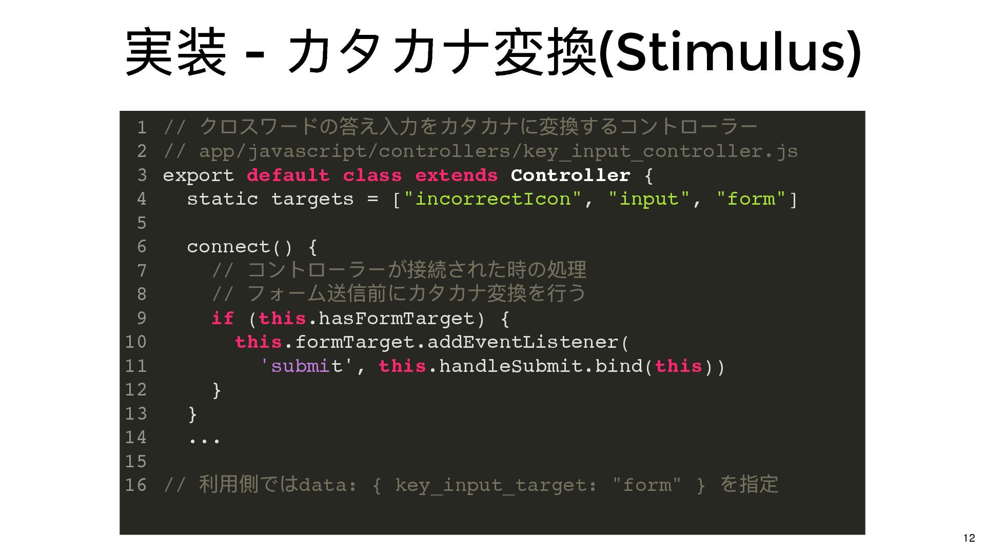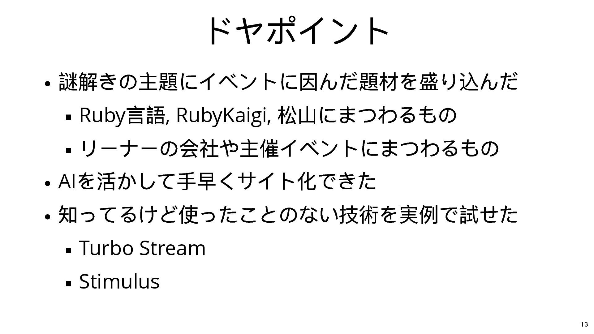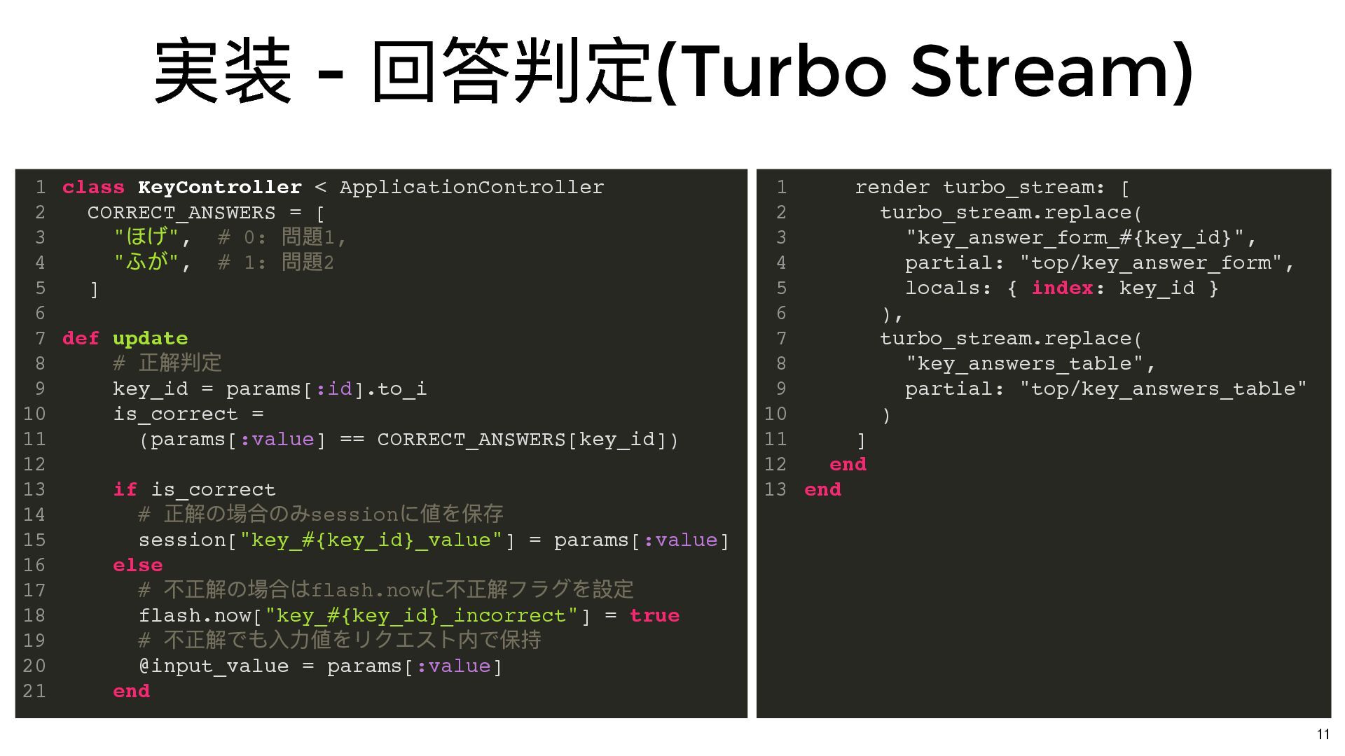 [ " ほげ", # 0: 問題1, " ふが", # 1: 問題2 ] def update # 正解判定 key_id = params[:id].to_i is_correct = (params[:value] == CORRECT_ANSWERS[key_id]) if is_correct # 正解の場合のみsession に値を保存 session["key_#{key_id}_value"] = params[:value] else # 不正解の場合はflash.now に不正解フラグを設定 flash.now["key_#{key_id}_incorrect"] = true # 不正解でも⼊⼒値をリクエスト内で保持 @input_value = params[:value] end 1 2 3 4 5 6 7 8 9 10 11 12 13 14 15 16 17 18 19 20 21 render turbo_stream: [ turbo_stream.replace( "key_answer_form_#{key_id}", partial: "top/key_answer_form", locals: { index: key_id } ), turbo_stream.replace( "key_answers_table", partial: "top/key_answers_table" ) ] end end 1 2 3 4 5 6 7 8 9 10 11 12 13 11