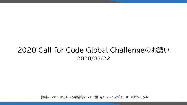2020 Call for Code Global Challengeのお誘い 2020/05/22 資料のシェアOK、むしろ積極的にシェア願い。ハッシュタグは、 #CallforCode 1