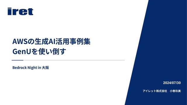 Bedrock Night in ⼤阪 2024/07/30 アイレット株式会社 ⼩巻玖美 AWSの⽣成AI活⽤事例集 GenUを使い倒す