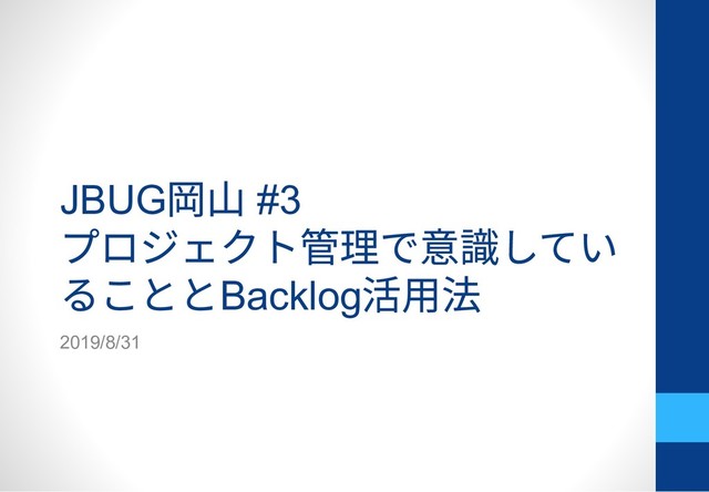 JBUG 岡⼭ #3 プロジェクト管理で意識してい ることとBacklog 活⽤法 2019/8/31