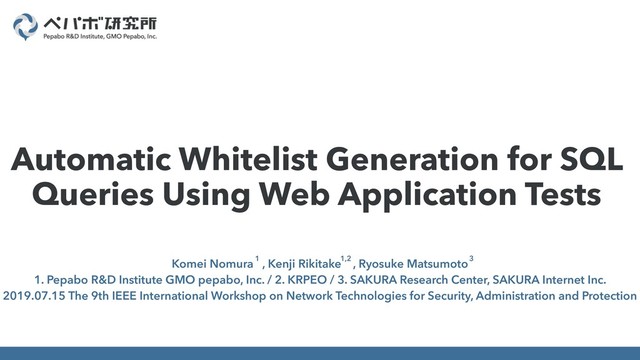 R&D Institute GMO pepabo, Inc. / 2. KRPEO / 3. SAKURA Research Center, SAKURA Internet Inc. 2019.07.15 The 9th IEEE International Workshop on Network Technologies for Security, Administration and Protection Automatic Whitelist Generation for SQL Queries Using Web Application Tests 1 1,2 3