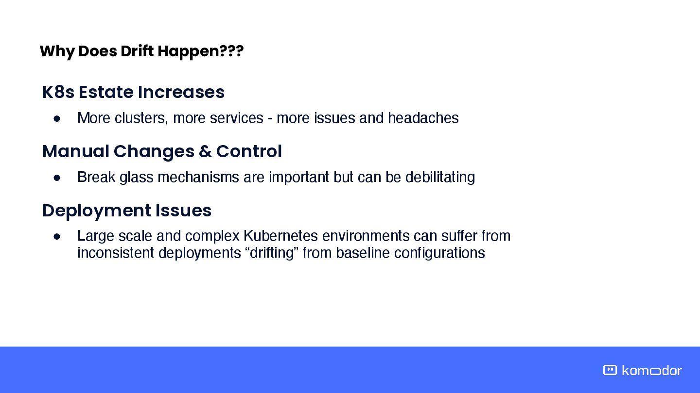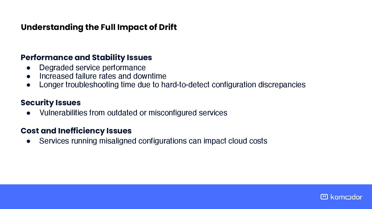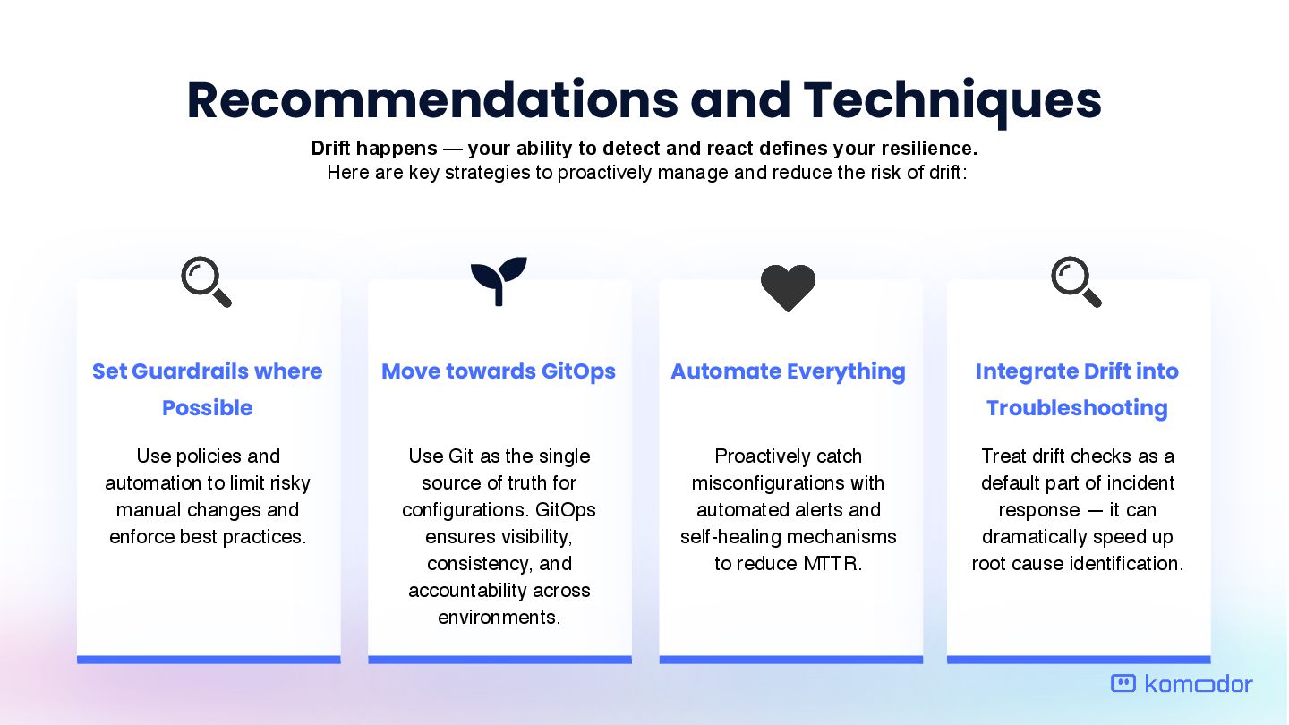 Automate Everything Drift happens — your ability to detect and react defines your resilience. Here are key strategies to proactively manage and reduce the risk of drift: Treat drift checks as a default part of incident response — it can dramatically speed up root cause identification. Integrate Drift into Troubleshooting