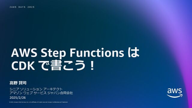 rights reserved. Amazon Confidential and Trademark. © 2025, Amazon Web Services, Inc. or its affiliates. All rights reserved. Amazon Confidential and Trademark. AWS Step Functions は CDK で書こう︕ ⾼野 賢司 J A W S D A Y S 2 0 2 5 シニア ソリューション アーキテクト アマゾン ウェブ サービス ジャパン合同会社 2025/2/26