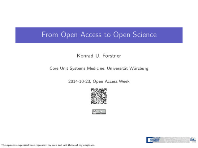 Core Unit Systems Medicine, Universit¨ at W¨ urzburg 2014-10-23, Open Access Week The opinions expressed here represent my own and not those of my employer.