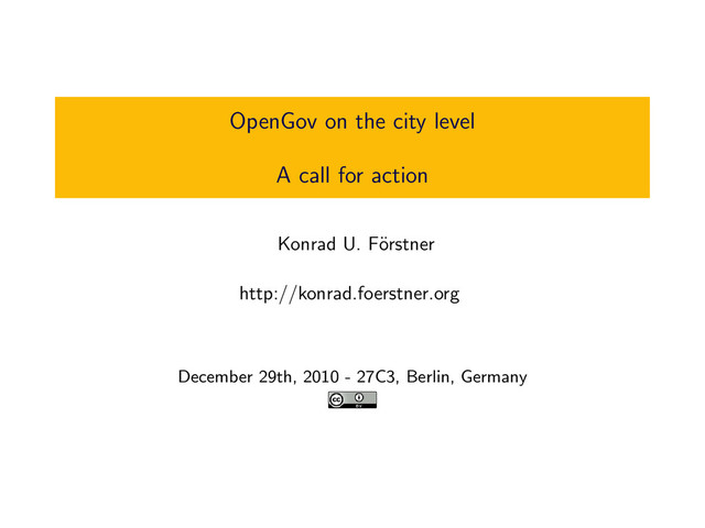 years some countries - e.g. the USA and UK - have started Open Government and Open Data initiatives. The aim is to increase transparency by making data like the documentations of spendings better accessible to their citizens in open and easily processable formats. Additionally, feedback channels are created to make participation in the decision process possible. Slide 2: So far the number of countries practicing OpenGov and OpenData is quite limited. Hopefully more countries following the mentioned examples and this becomes a global trend. Slide 3: But in my opinion it is hard to start this change on the country level. To increase the speed of this process it might be beneficial to initiate the change from the city/community level. People in charge on the local level are usually easier to reach than the high level professional politicians. Slide 4: Many politicians start their career on the local level. If they would learn the principles of OpenData and OpenGov they might get used to it and take to the higher levels. Slide 5: Additionally, the effort to work on the local level is lower and it is easier to recruit further people to become active. Slide 6: Starting is pretty easy. First check on the website of your city which data is available already and what you personally miss there. E.g. Can you find a list of spendings of the last years? How detailed is this list? Is there a proper archive of this data? Is the data hidden in PDF of doc files or available in an easy to process formats like XML or CSV? Slide 7: Tell your result to politicians and other people and mention why you think transparency matters and that OpenGov/OpenData is an important part of modern democracy. Slide 8: Make visualizations of available data and show them how useful this can be. They are an powerful tool to grab the essence of information quickly. Slide 9:If you want to spend more time help building tools and streamline the publication and analysis of data. Be creative! Slide 10: I hope I could inspire some of you to become active. Thanks for listening.