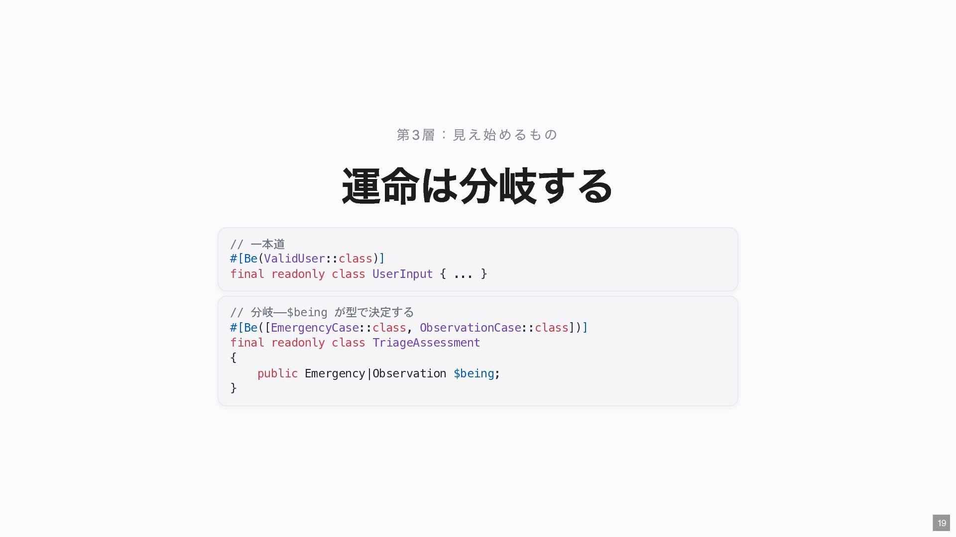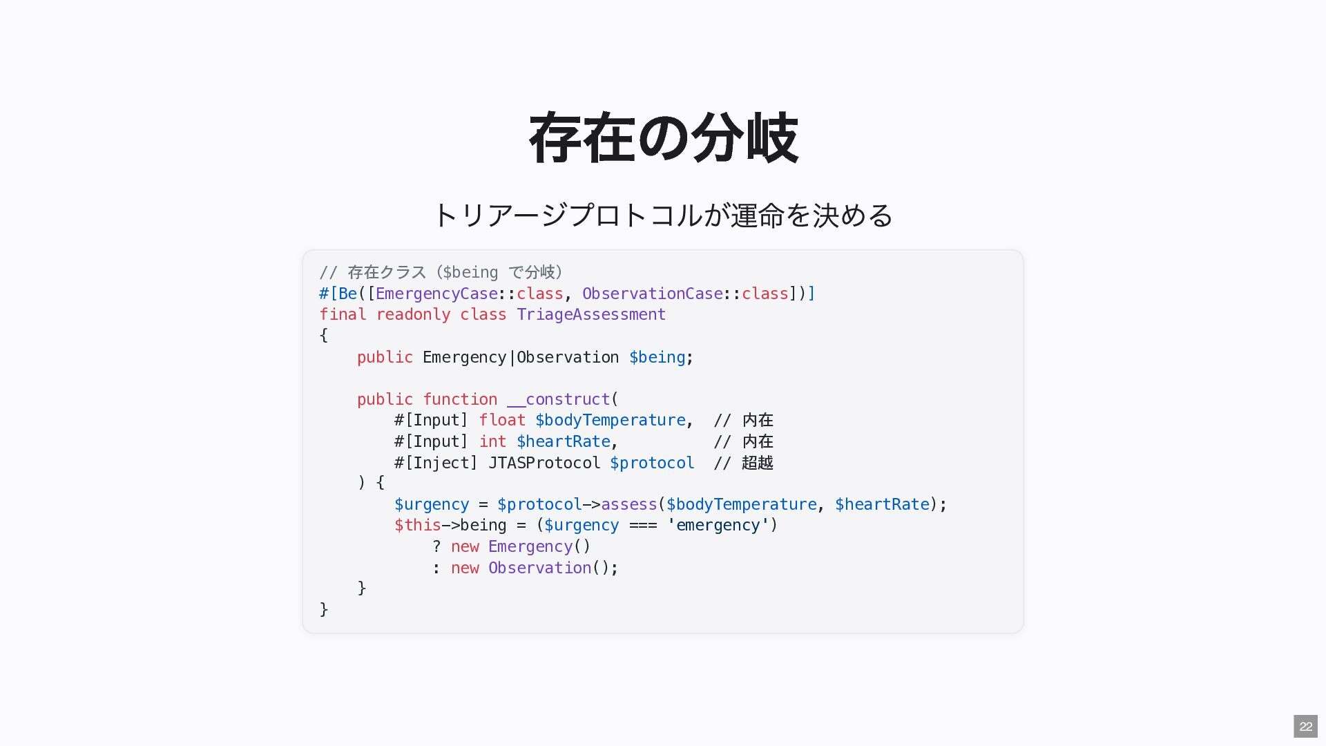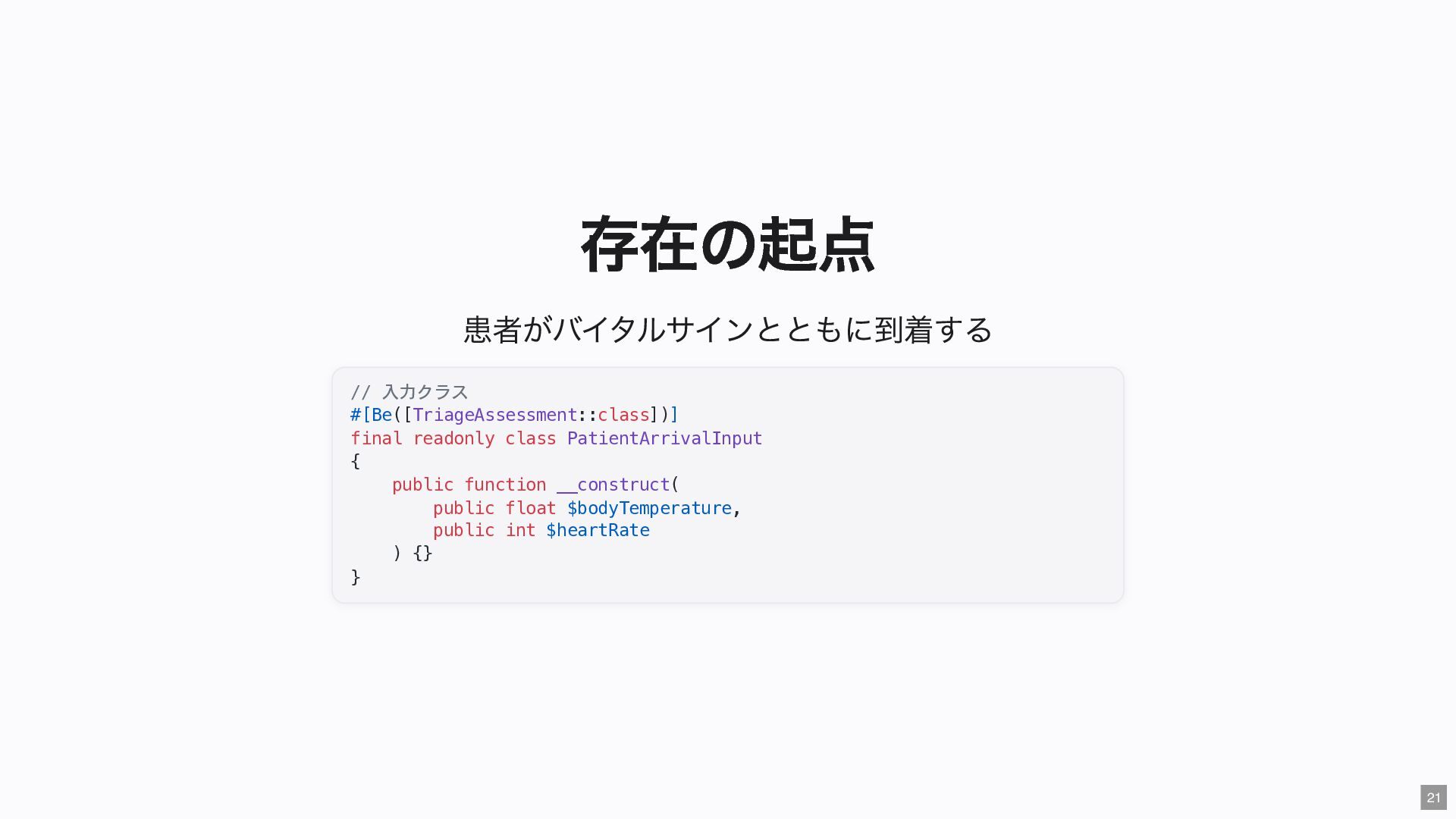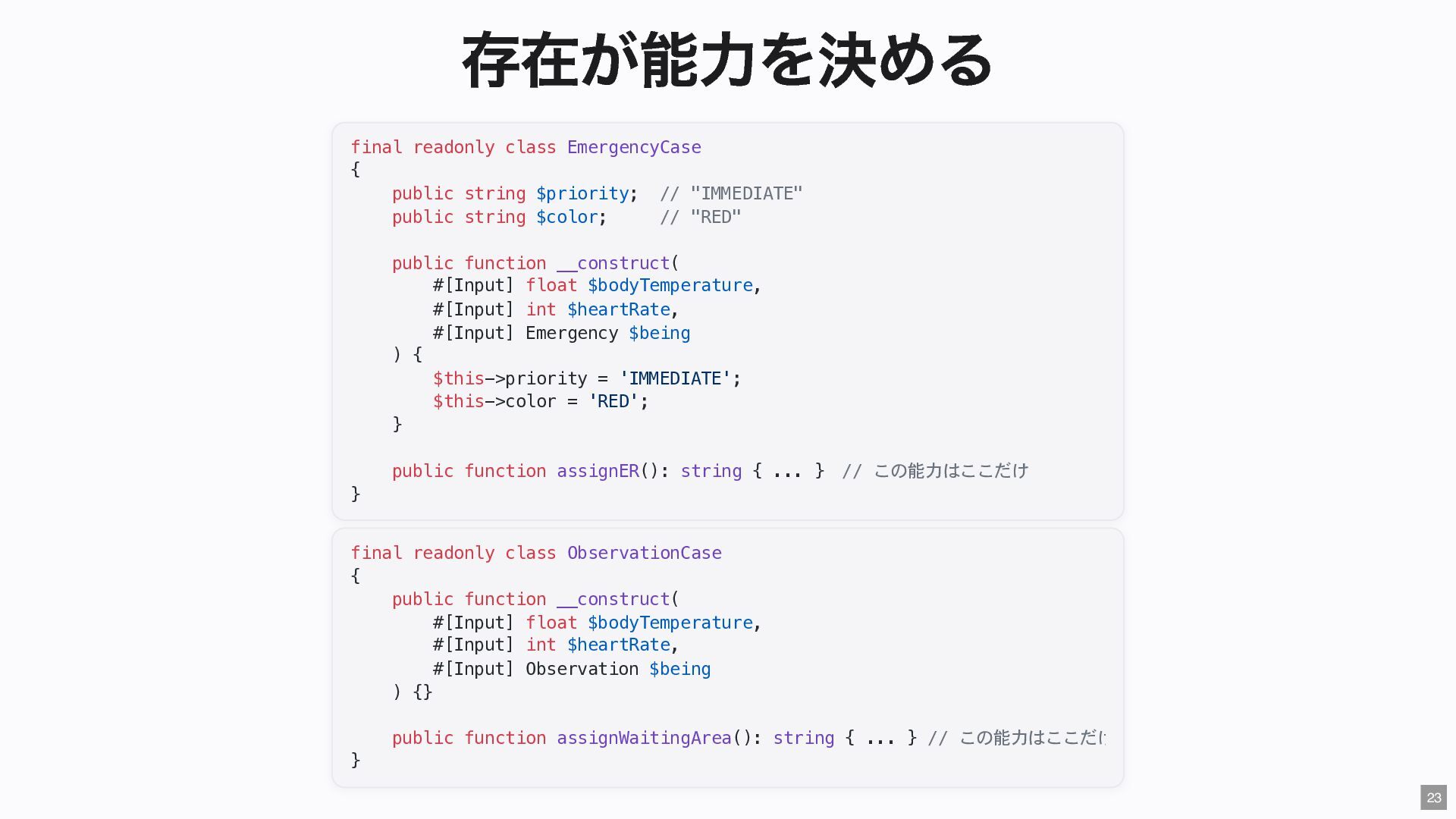 "IMMEDIATE" public string $color; // "RED" public function __construct( #[Input] float $bodyTemperature, #[Input] int $heartRate, #[Input] Emergency $being ) { $this->priority = 'IMMEDIATE'; $this->color = 'RED'; } public function assignER(): string { ... } // この能力はここだけ } final readonly class ObservationCase { public function __construct( #[Input] float $bodyTemperature, #[Input] int $heartRate, #[Input] Observation $being ) {} public function assignWaitingArea(): string { ... } // この能力はここだけ } 23