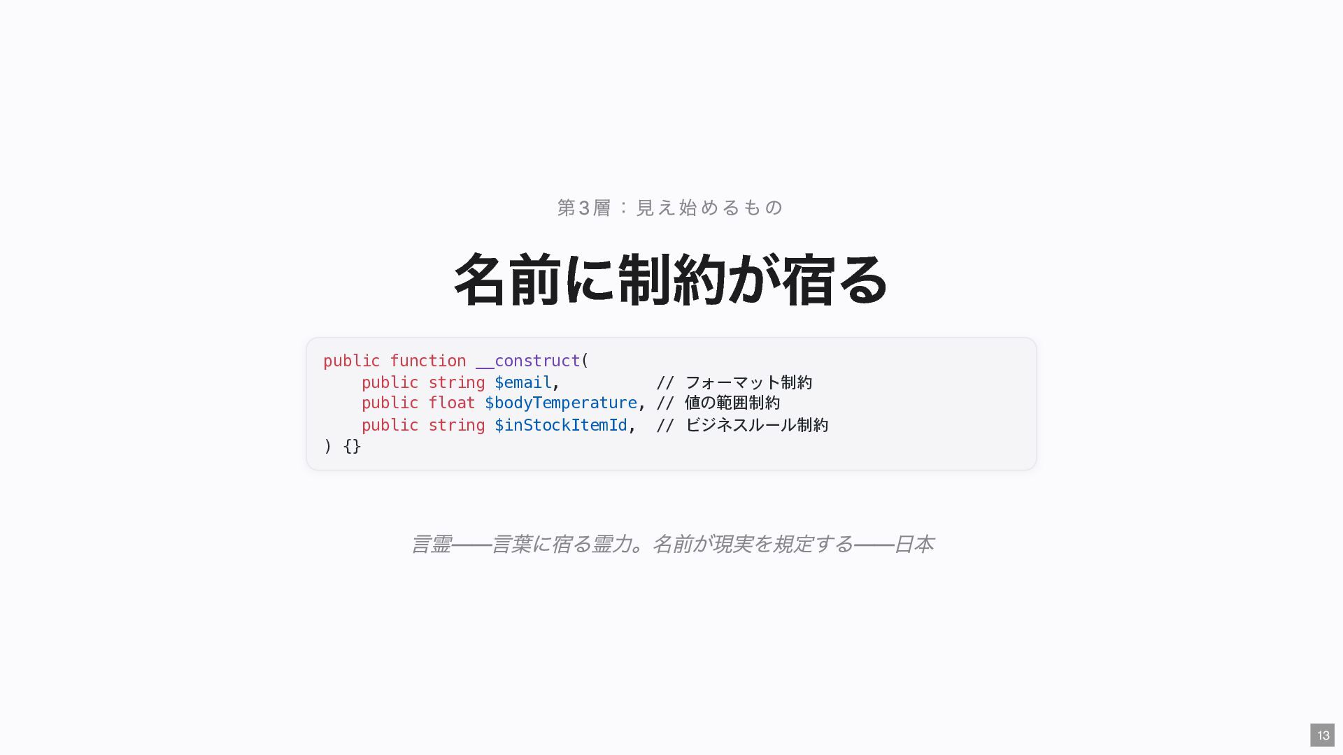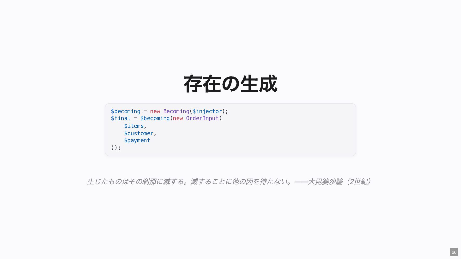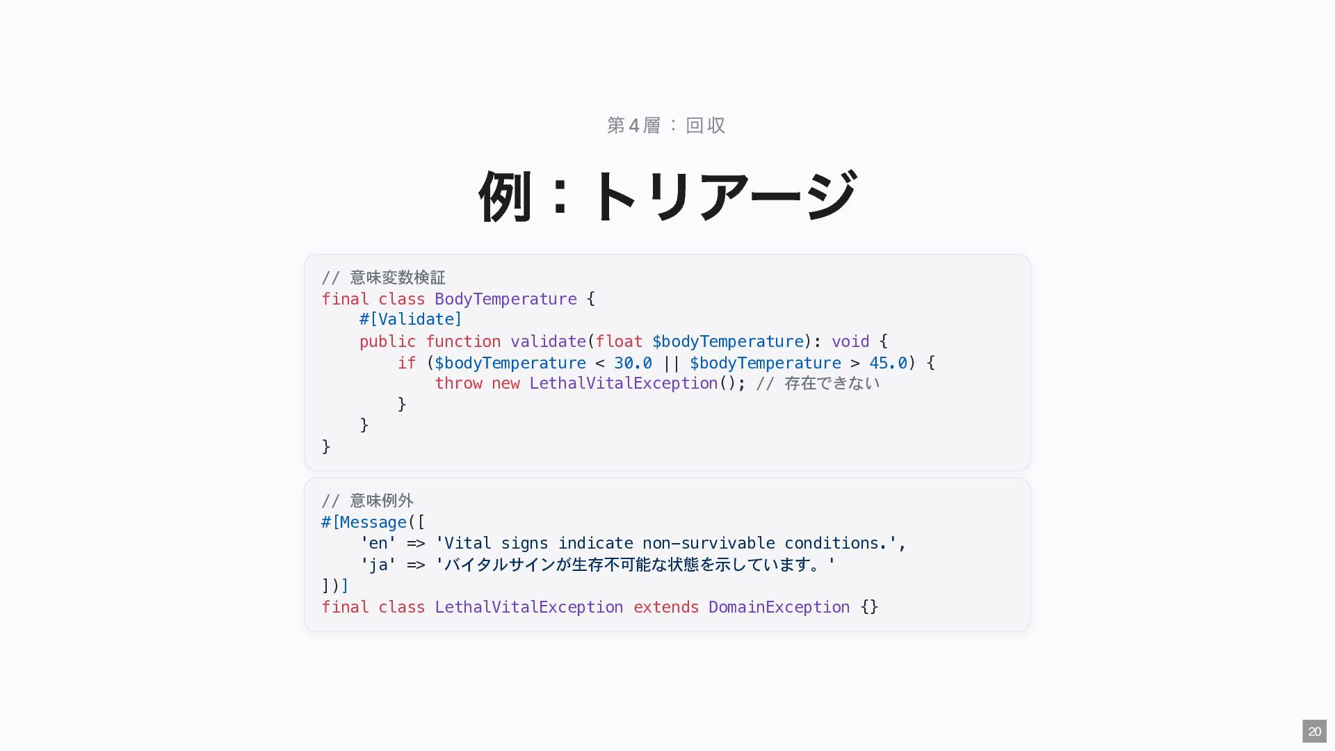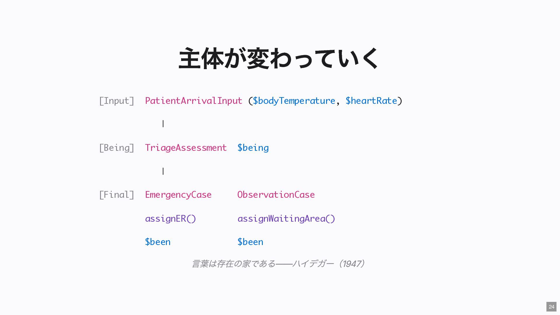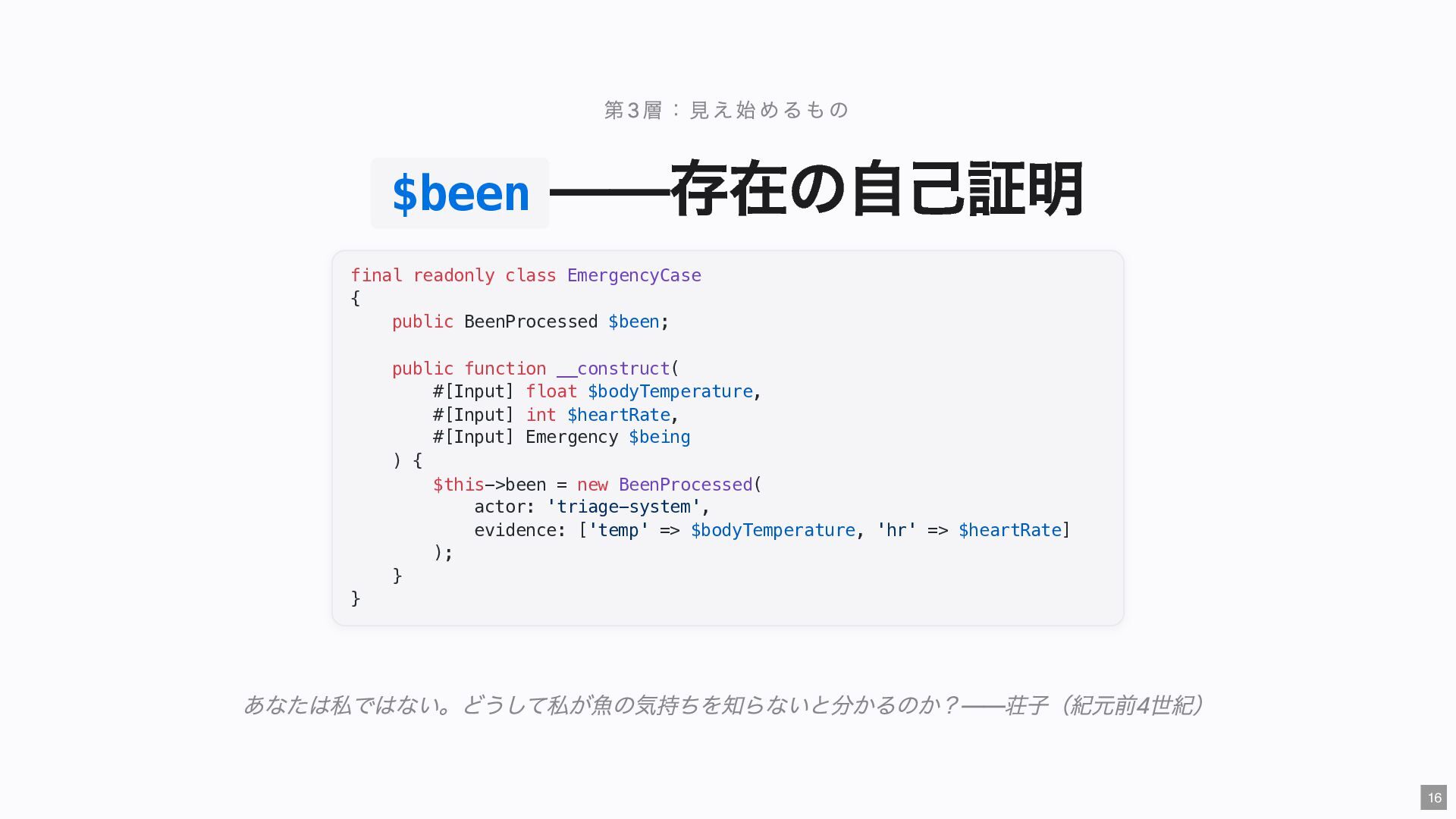 "IMMEDIATE" public string $color; // "RED" public function __construct( #[Input] float $bodyTemperature, #[Input] int $heartRate, #[Input] Emergency $being ) { $this->priority = 'IMMEDIATE'; $this->color = 'RED'; } public function assignER(): string { ... } // この能力はここだけ } final readonly class ObservationCase { public function __construct( #[Input] float $bodyTemperature, #[Input] int $heartRate, #[Input] Observation $being ) {} public function assignWaitingArea(): string { ... } // この能力はここだけ } 23