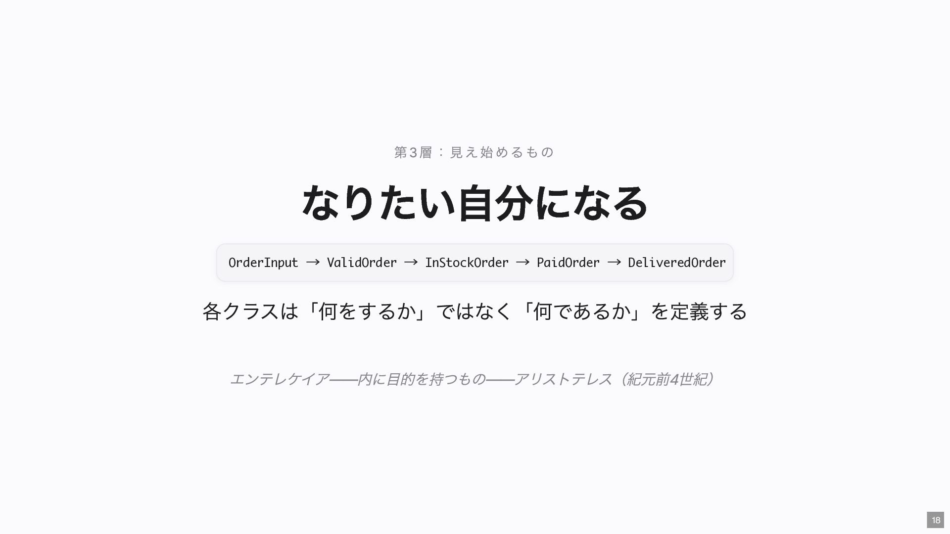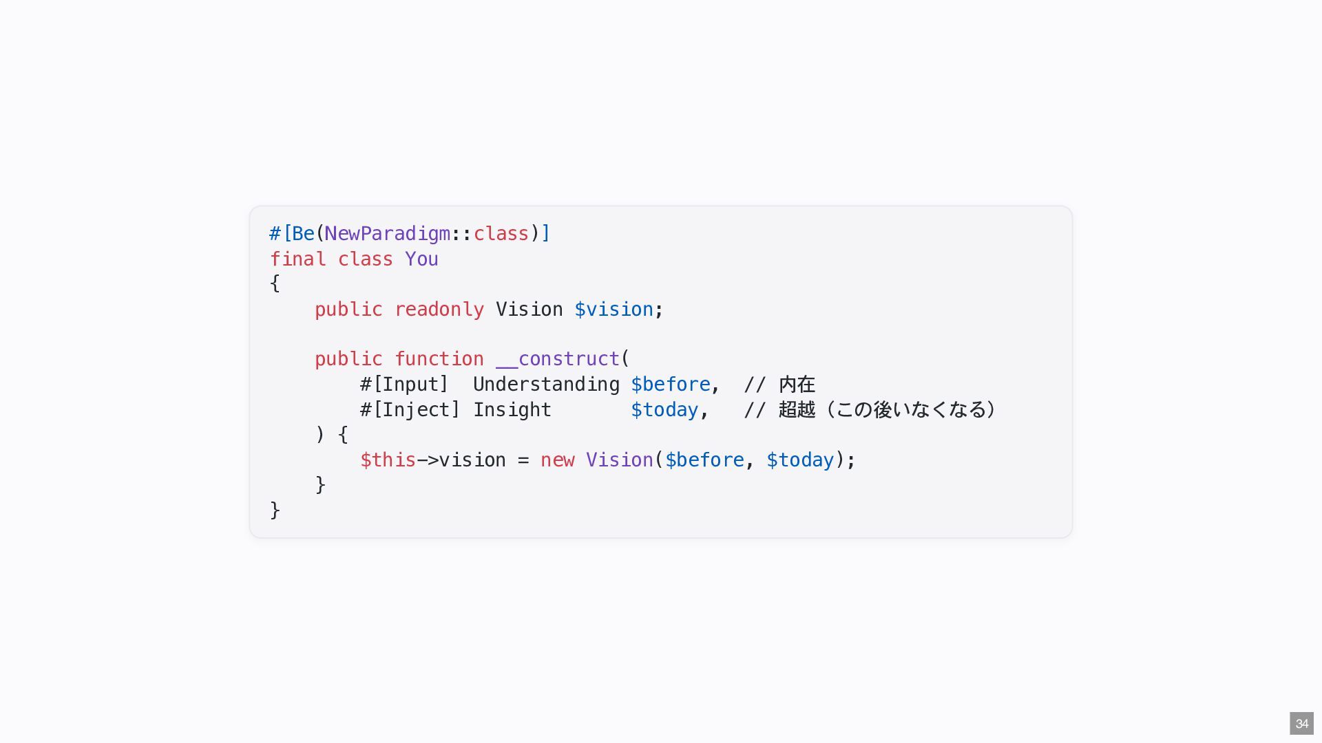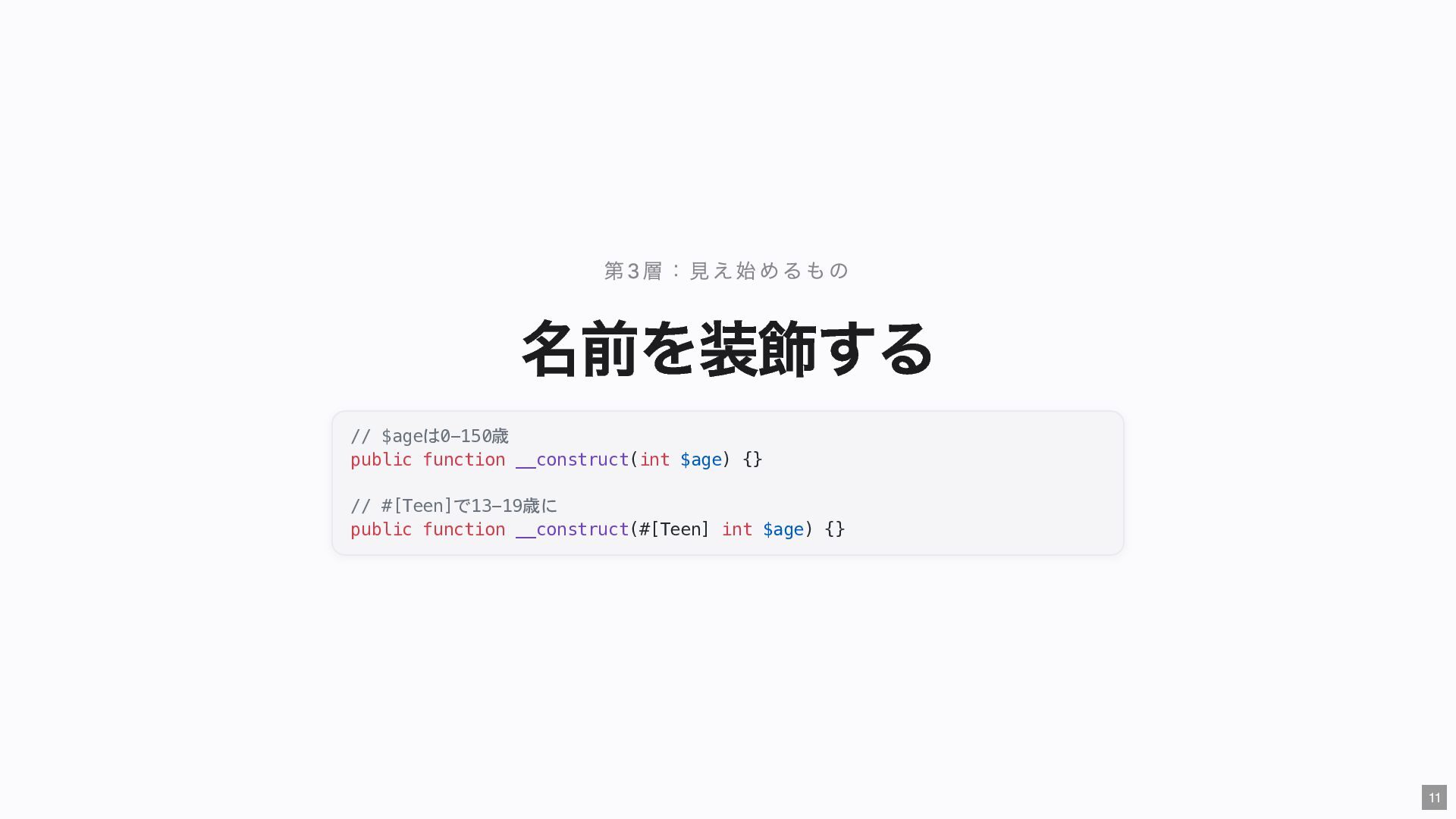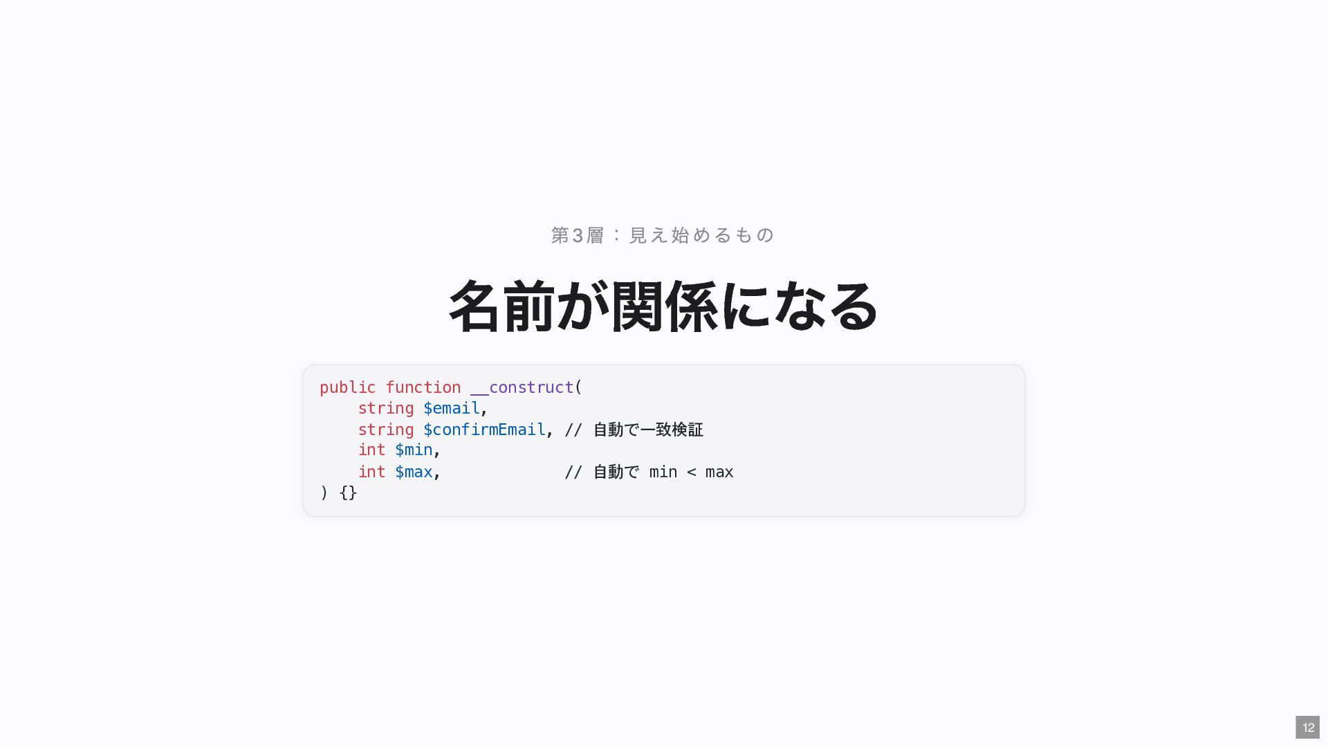 "IMMEDIATE" public string $color; // "RED" public function __construct( #[Input] float $bodyTemperature, #[Input] int $heartRate, #[Input] Emergency $being ) { $this->priority = 'IMMEDIATE'; $this->color = 'RED'; } public function assignER(): string { ... } // この能力はここだけ } final readonly class ObservationCase { public function __construct( #[Input] float $bodyTemperature, #[Input] int $heartRate, #[Input] Observation $being ) {} public function assignWaitingArea(): string { ... } // この能力はここだけ } 23