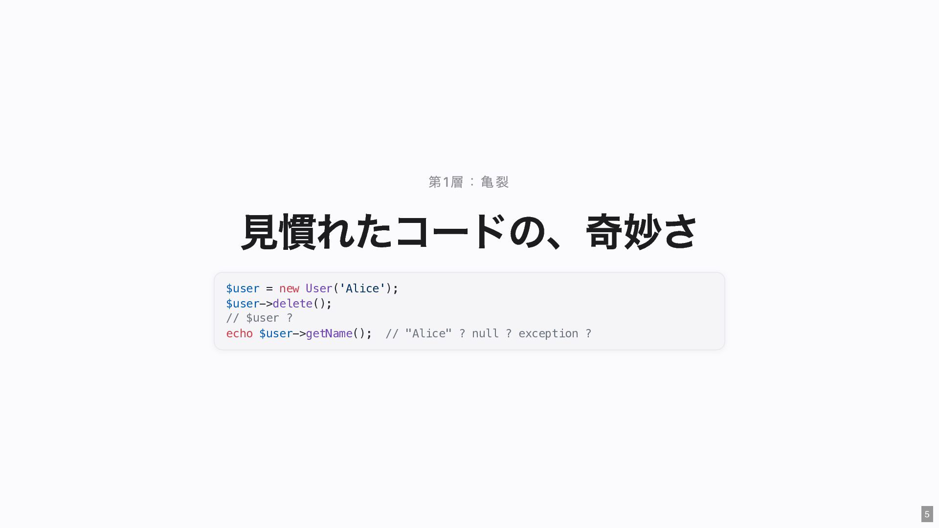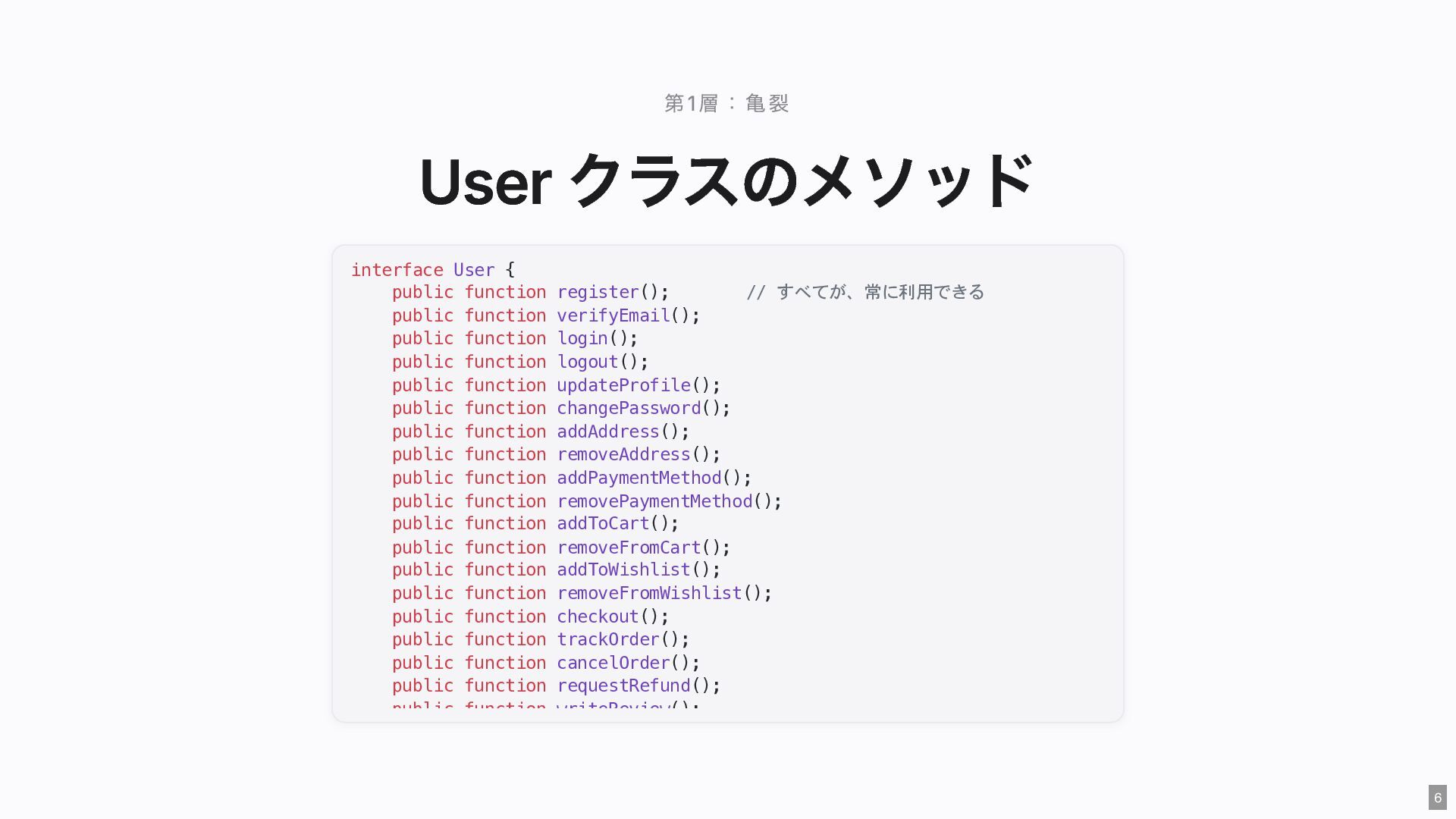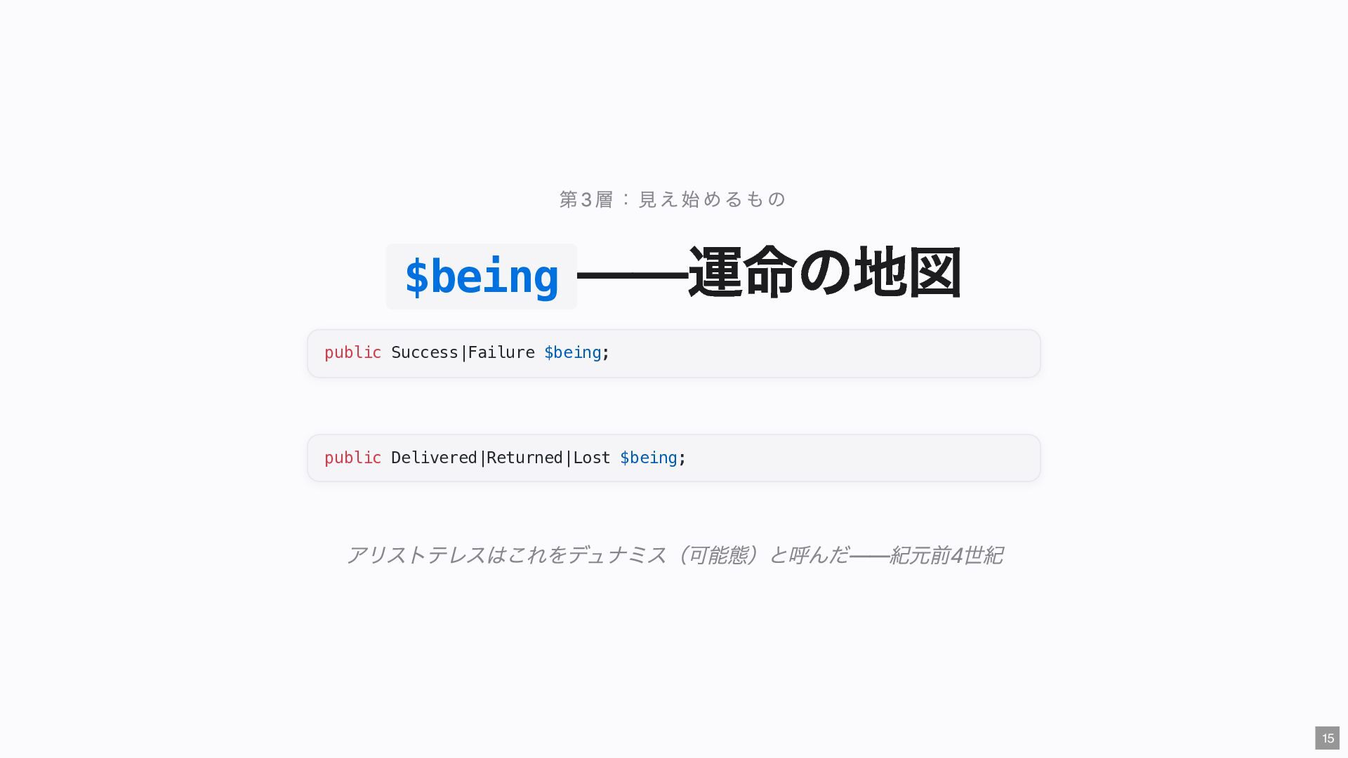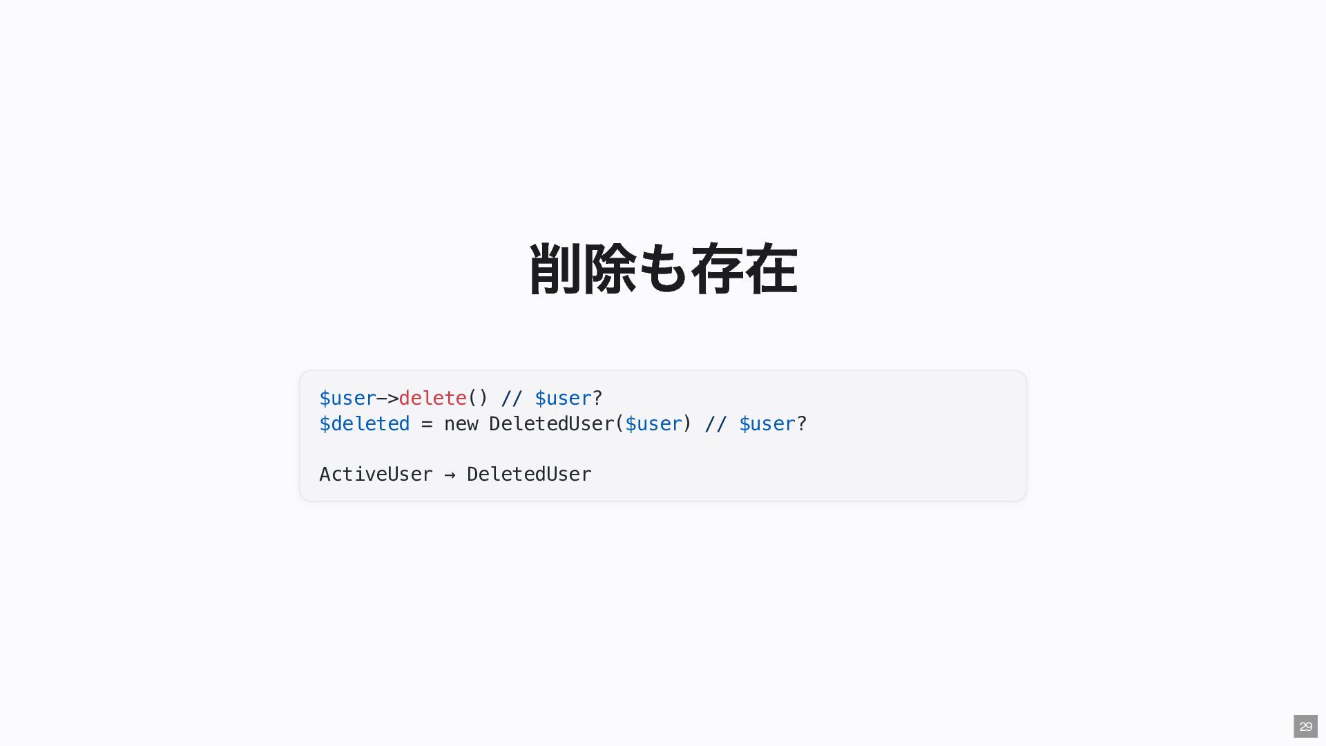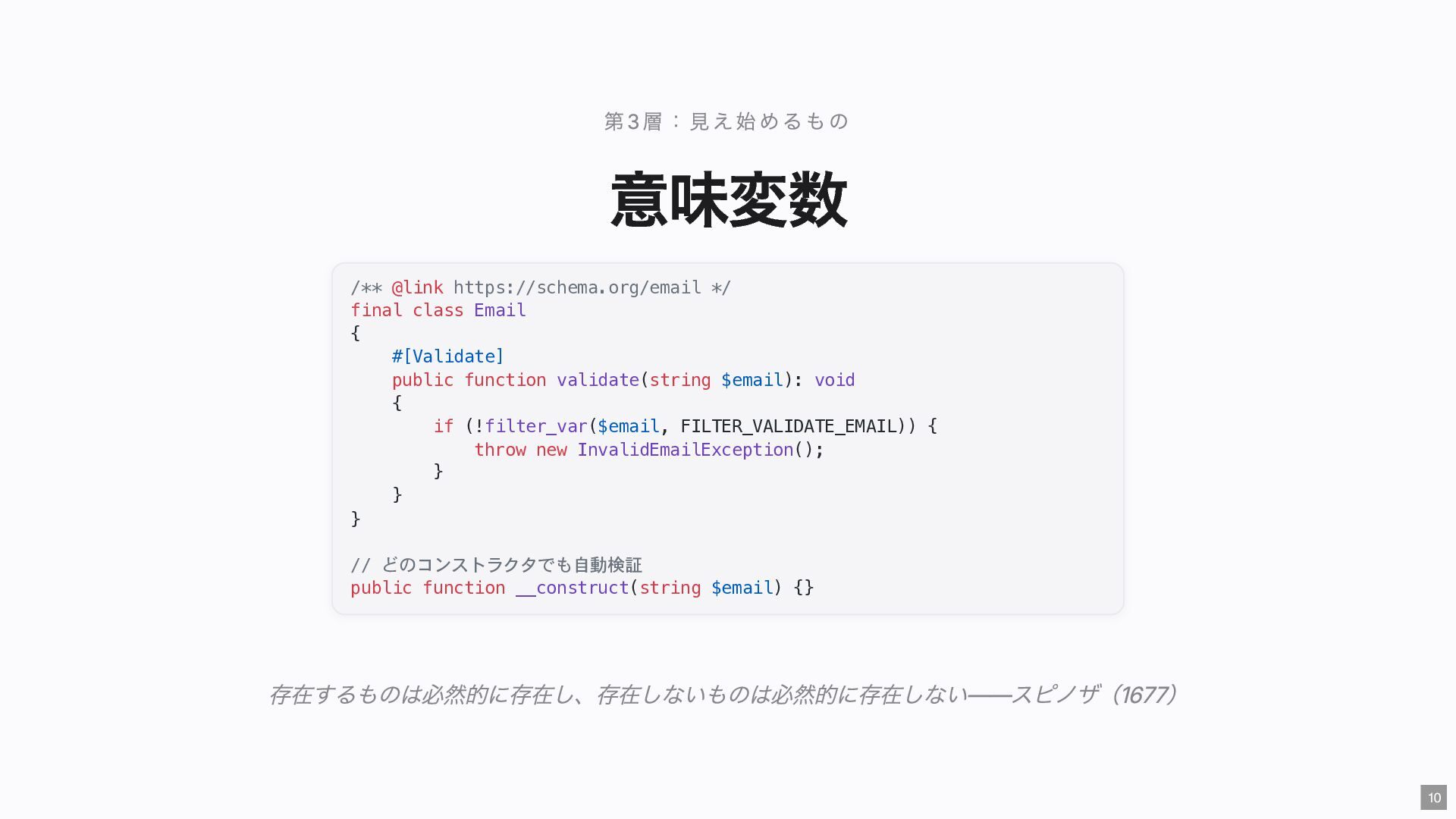 "IMMEDIATE" public string $color; // "RED" public function __construct( #[Input] float $bodyTemperature, #[Input] int $heartRate, #[Input] Emergency $being ) { $this->priority = 'IMMEDIATE'; $this->color = 'RED'; } public function assignER(): string { ... } // この能力はここだけ } final readonly class ObservationCase { public function __construct( #[Input] float $bodyTemperature, #[Input] int $heartRate, #[Input] Observation $being ) {} public function assignWaitingArea(): string { ... } // この能力はここだけ } 23