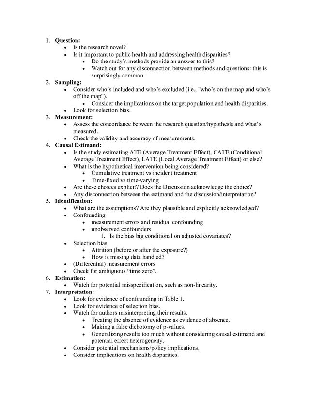 important to public health and addressing health disparities? • Do the study’s methods provide an answer to this? • Watch out for any disconnection between methods and questions: this is surprisingly common. 2. Sampling: • Consider who’s included and who’s excluded (i.e., "who’s on the map and who’s off the map"). • Consider the implications on the target population and health disparities. • Look for selection bias. 3. Measurement: • Assess the concordance between the research question/hypothesis and what’s measured. • Check the validity and accuracy of measurements. 4. Causal Estimand: • Is the study estimating ATE (Average Treatment Effect), CATE (Conditional Average Treatment Effect), LATE (Local Average Treatment Effect) or else? • What is the hypothetical intervention being considered? • Cumulative treatment vs incident treatment • Time-fixed vs time-varying • Are these choices explicit? Does the Discussion acknowledge the choice? • Any disconnection between the estimand and the discussion/interpretation? 5. Identification: • What are the assumptions? Are they plausible and explicitly acknowledged? • Confounding • measurement errors and residual confounding • unobserved confounders 1. Is the bias big conditional on adjusted covariates? • Selection bias • Attrition (before or after the exposure?) • How is missing data handled? • (Differential) measurement errors • Check for ambiguous “time zero”. 6. Estimation: • Watch for potential misspecification, such as non-linearity. 7. Interpretation: • Look for evidence of confounding in Table 1. • Look for evidence of selection bias. • Watch for authors misinterpreting their results. • Treating the absence of evidence as evidence of absence. • Making a false dichotomy of p-values. • Generalizing results too much without considering causal estimand and potential effect heterogeneity. • Consider potential mechanisms/policy implications. • Consider implications on health disparities.