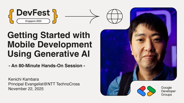 This is the slide, "Getting Started with Mobile Development Using Generative AI" at DevFest Singapore 2025. It's an 80-Minute Hands-On Session.