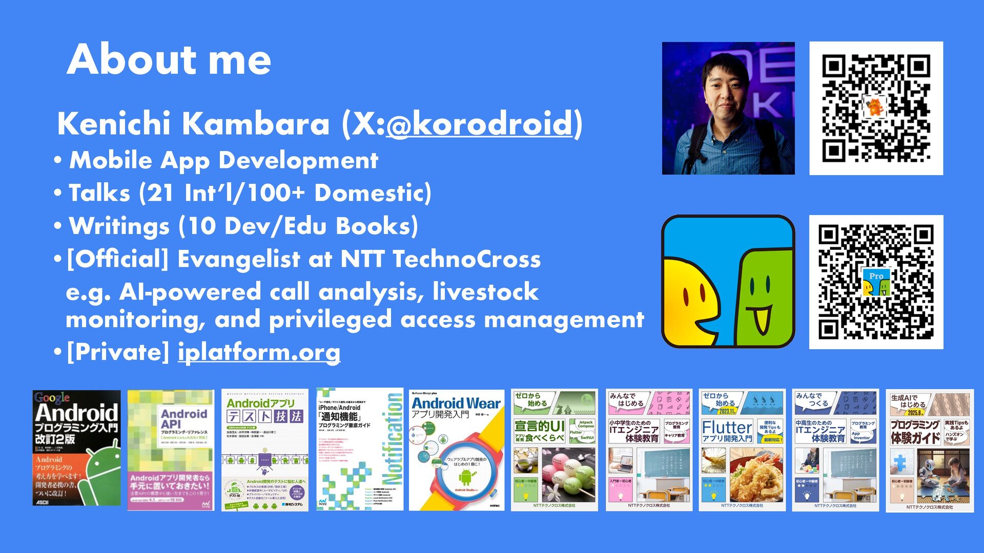 Books) •[Of fi cial] Evangelist at NTT TechnoCross e.g. AI-powered call analysis, livestock monitoring, and privileged access management •[Private] iplatform.org About me Kenichi Kambara (X:@korodroid)