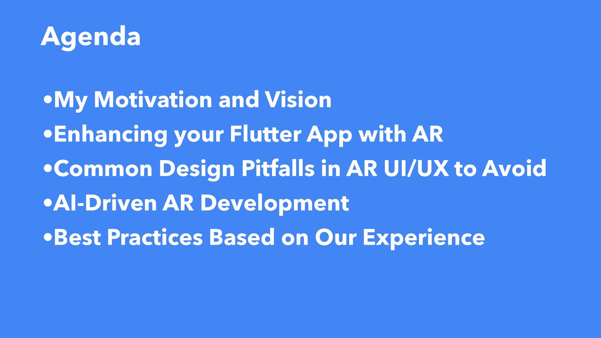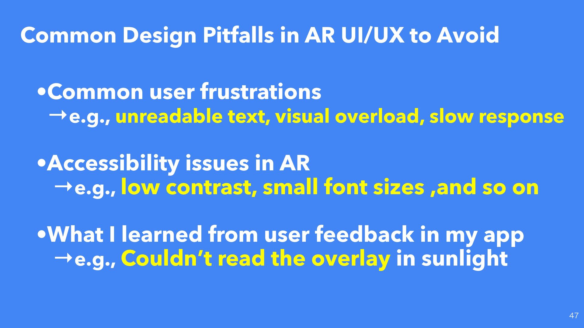 user frustrations →e.g., unreadable text, visual overload, slow response •Accessibility issues in AR →e.g., low contrast, small font sizes ,and so on •What I learned from user feedback in my app →e.g., Couldn’t read the overlay in sunlight
