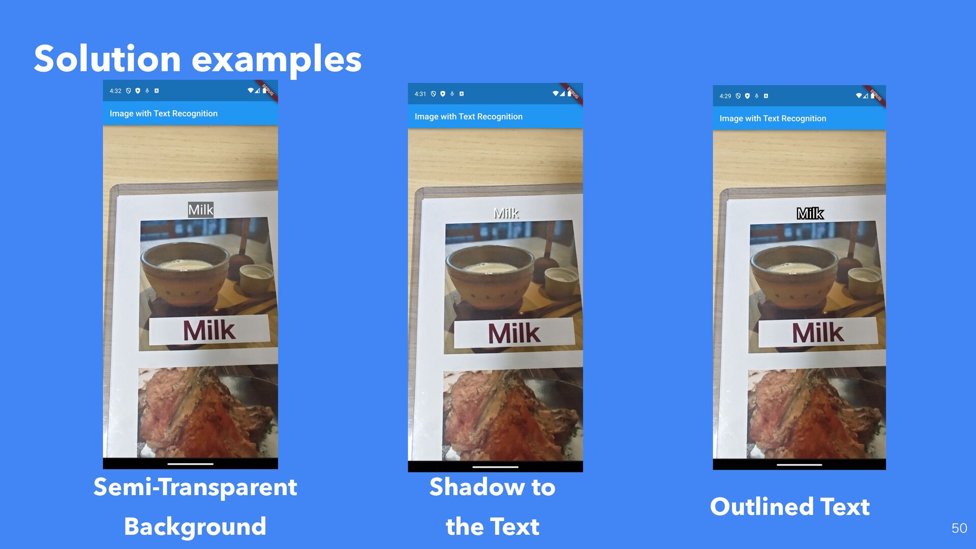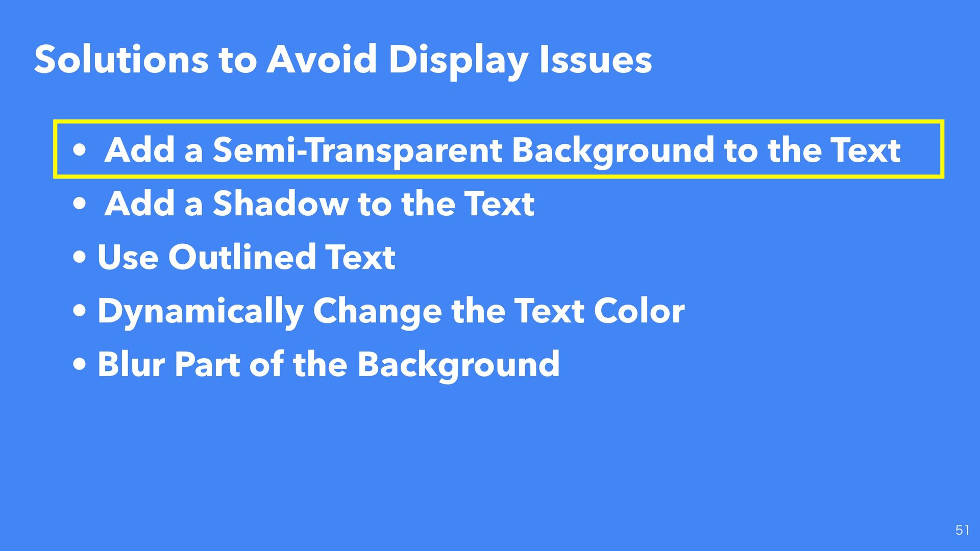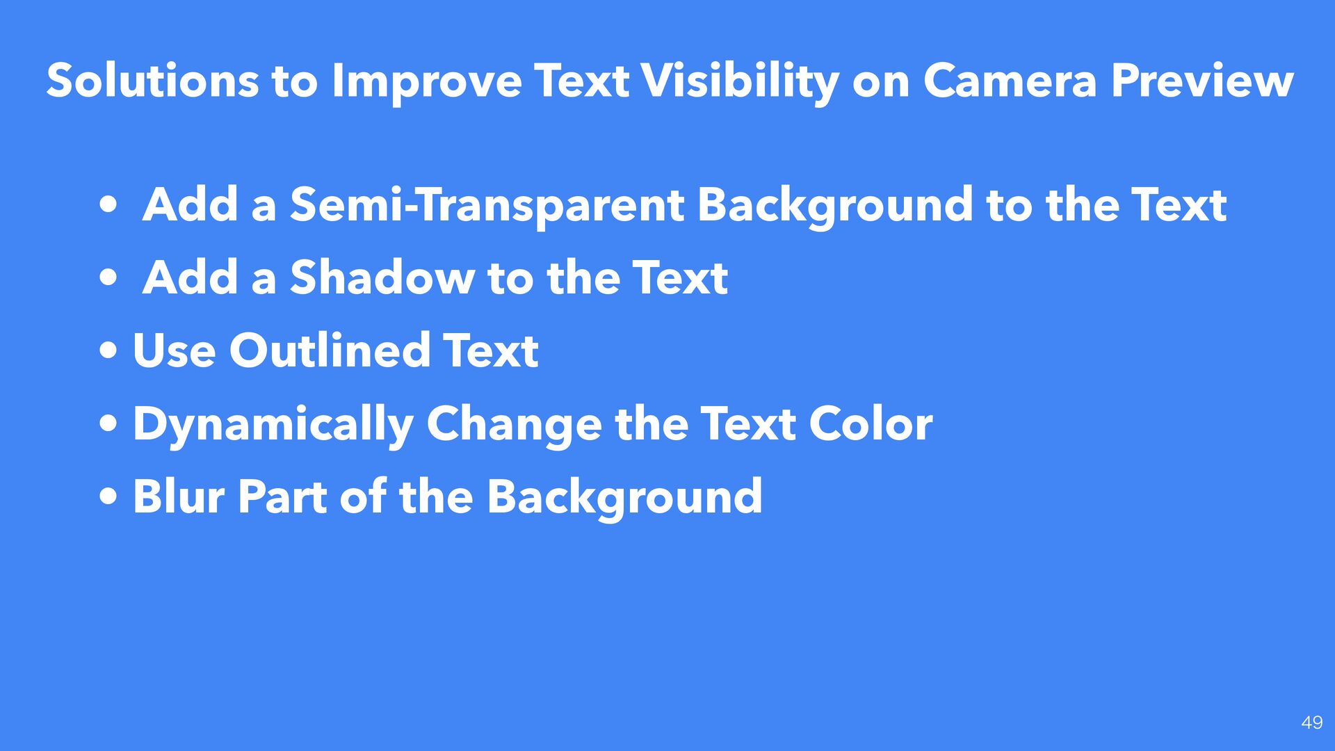 Add a Shadow to the Text • Use Outlined Text • Dynamically Change the Text Color • Blur Part of the Background Solutions to Improve Text Visibility on Camera Preview
