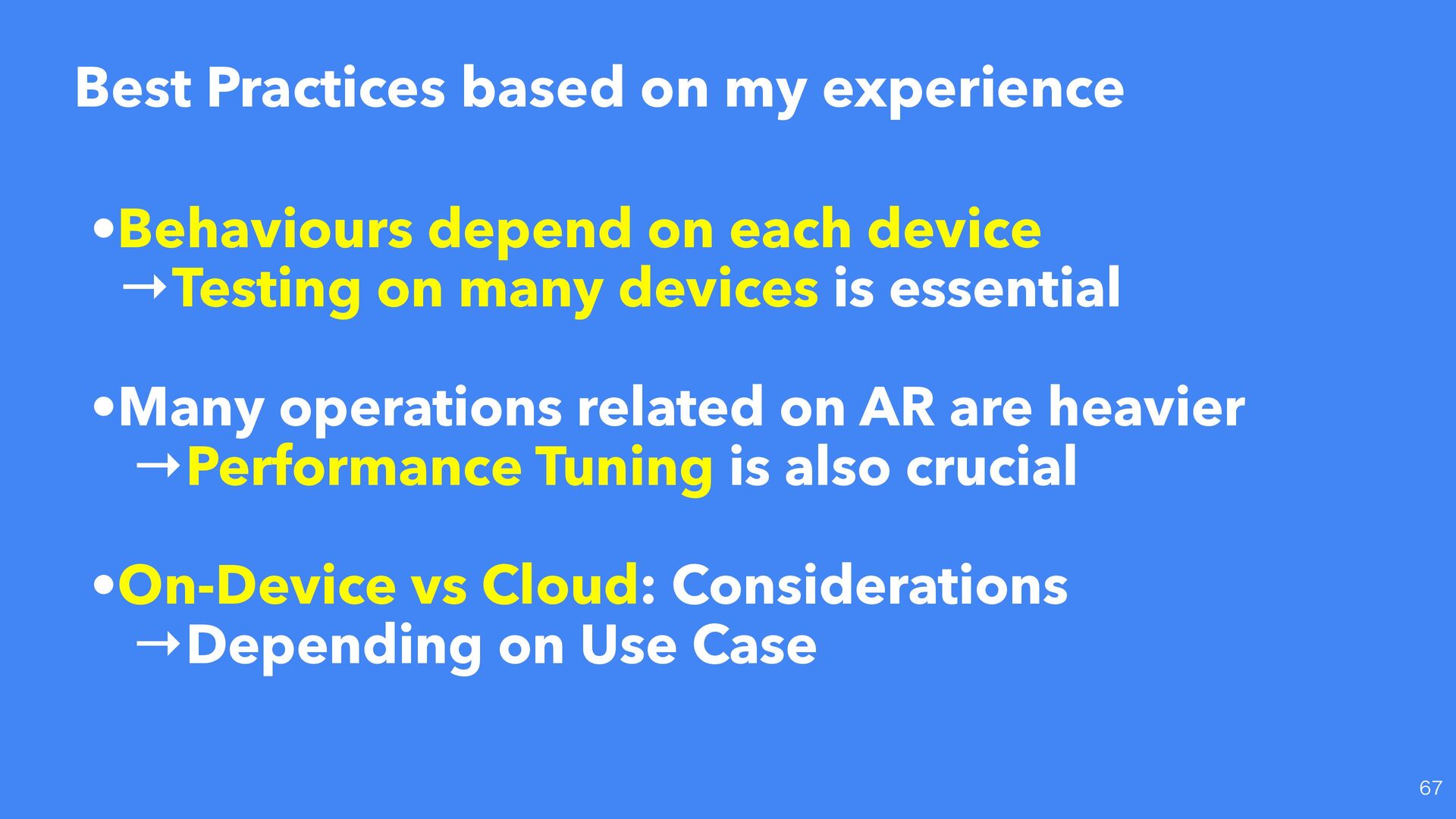 device →Testing on many devices is essential •Many operations related on AR are heavier →Performance Tuning is also crucial •On-Device vs Cloud: Considerations →Depending on Use Case