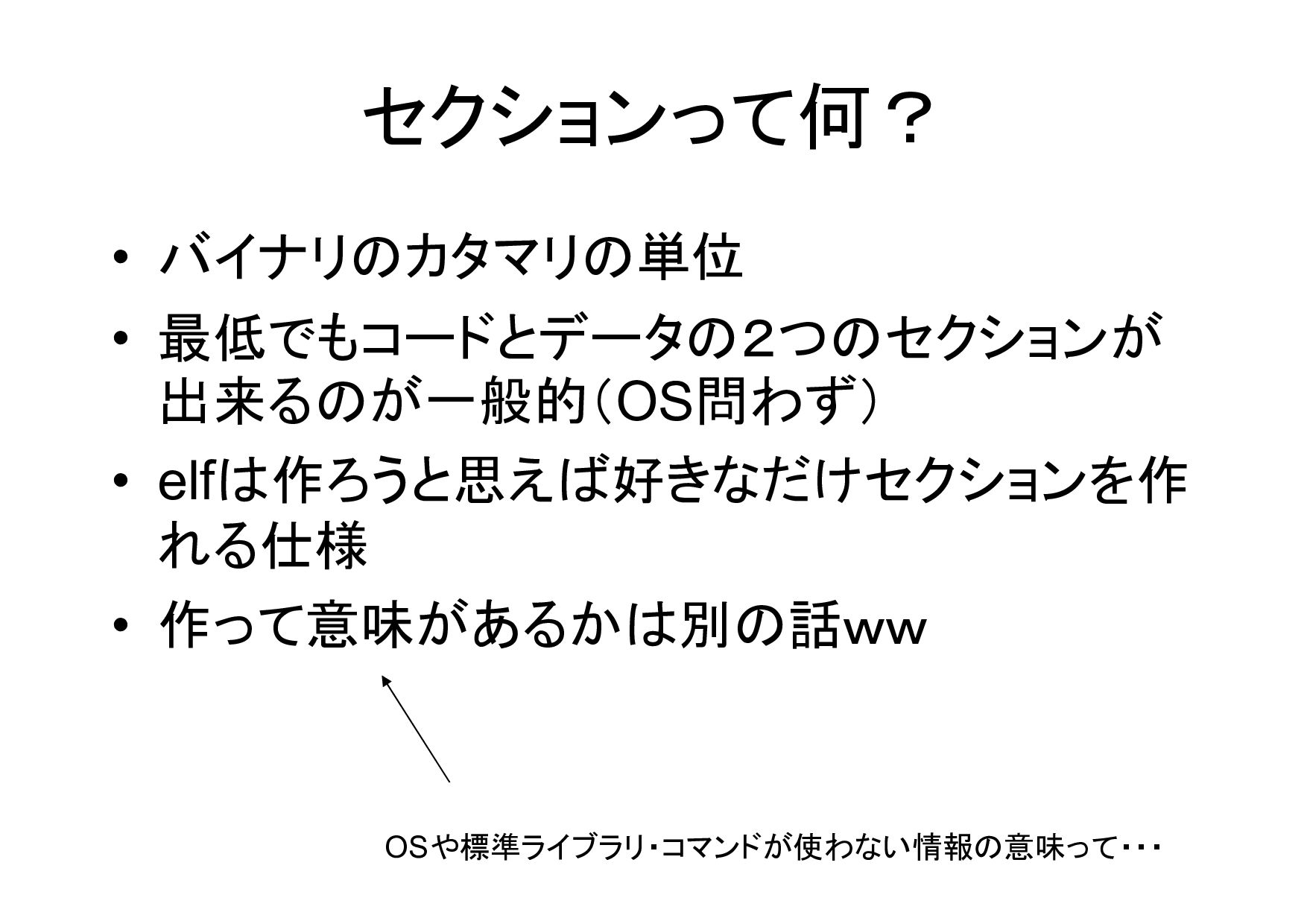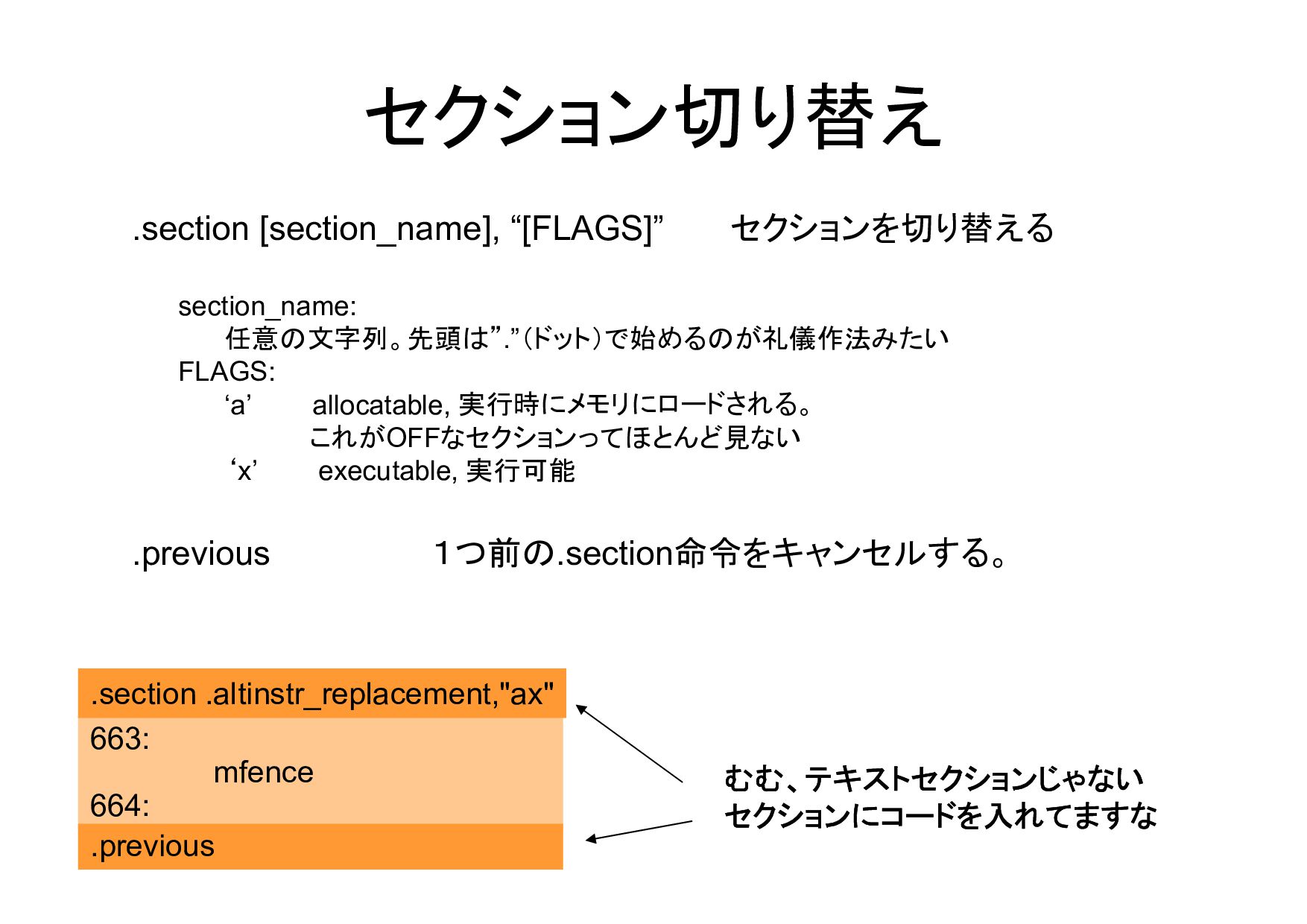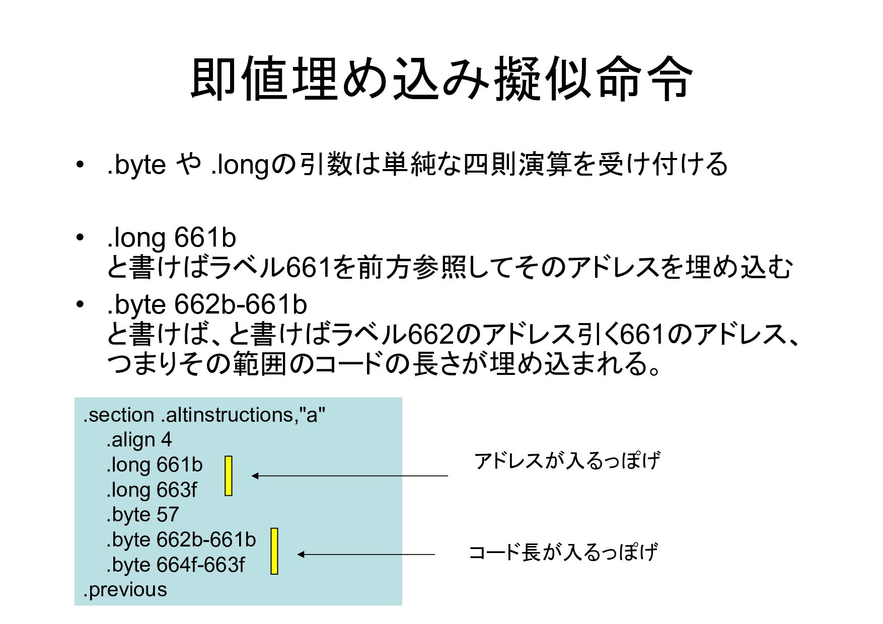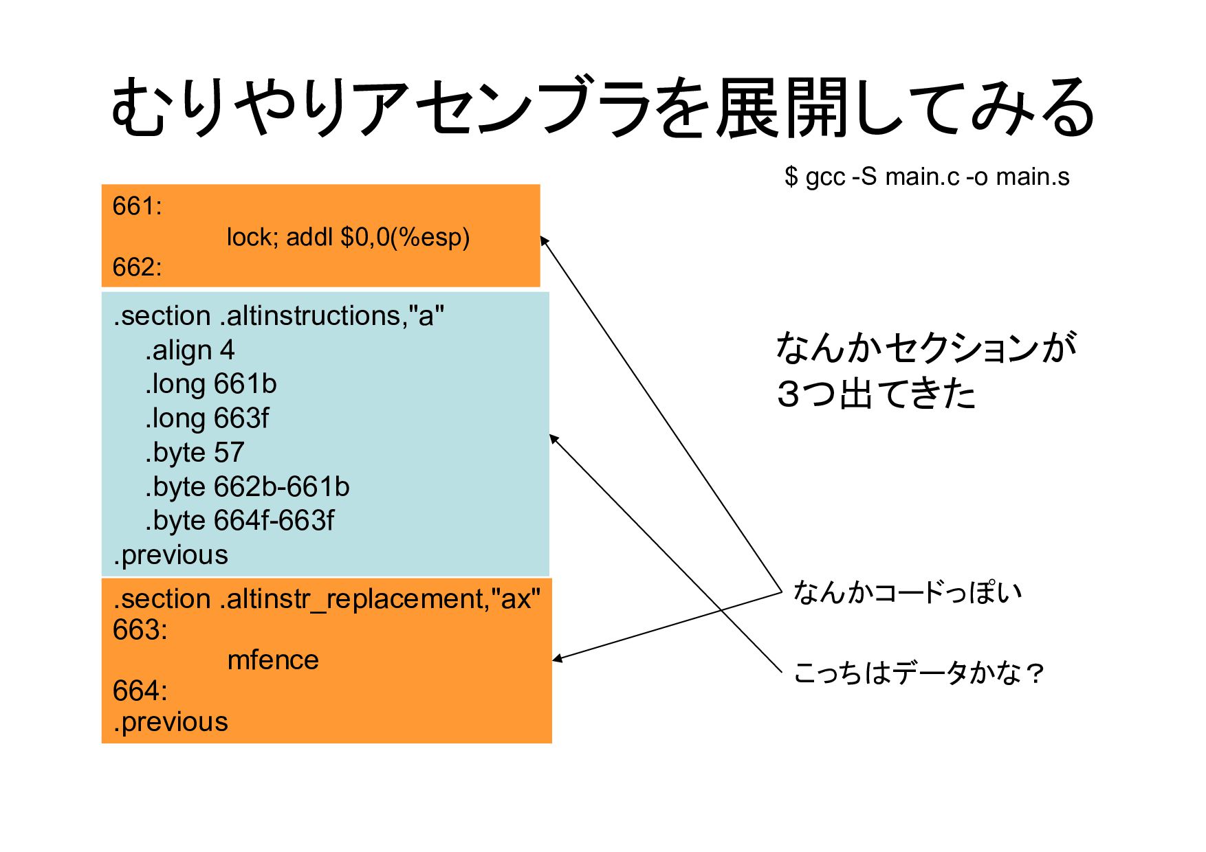 12 .altinstr_replacement 00000006 0804841c 0804841c 0000041c 2**0 CONTENTS, ALLOC, LOAD, READONLY, CODE 13 .fini 0000001a 08048424 08048424 00000424 2**2 CONTENTS, ALLOC, LOAD, READONLY, CODE 14 .rodata 00000008 08048440 08048440 00000440 2**2 CONTENTS, ALLOC, LOAD, READONLY, DATA 15 .altinstructions 00000017 08048448 08048448 00000448 2**2 CONTENTS, ALLOC, LOAD, READONLY, DATA さっきの、なんちゃって main.c をコンパイルして objdump a.out 中でのセクションのファイルオフセットとサイズが分かるので・・・