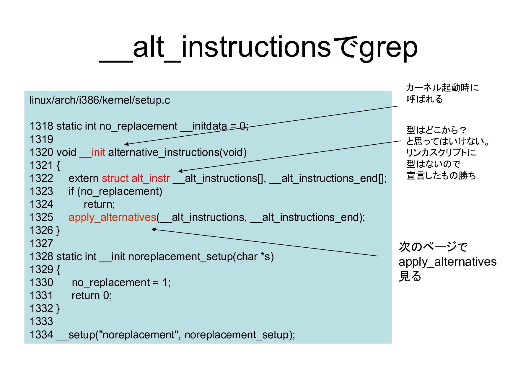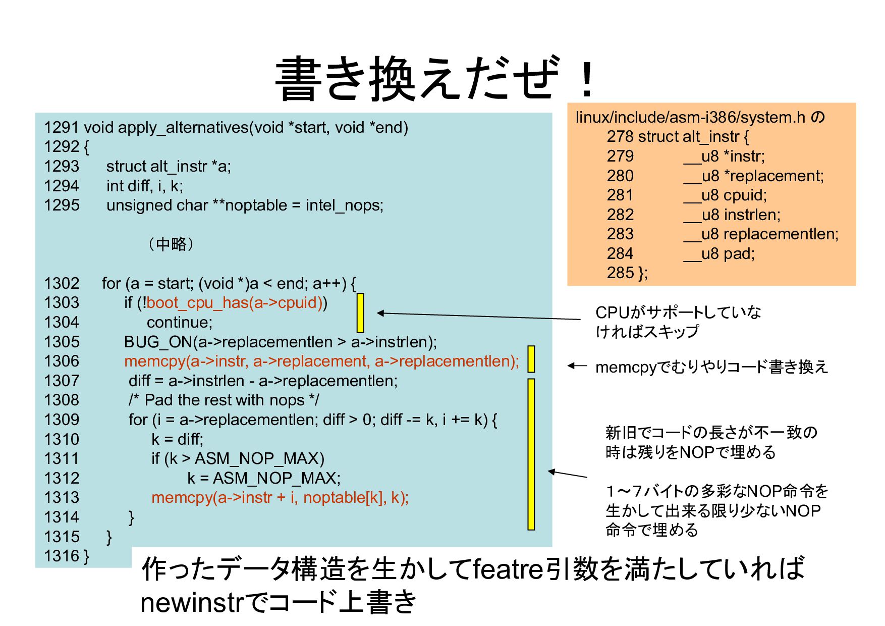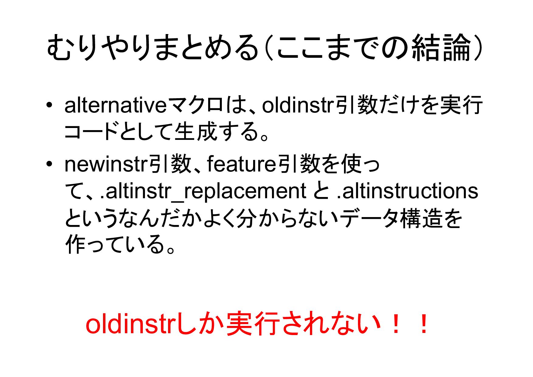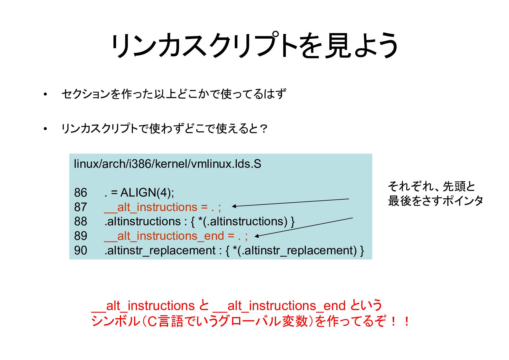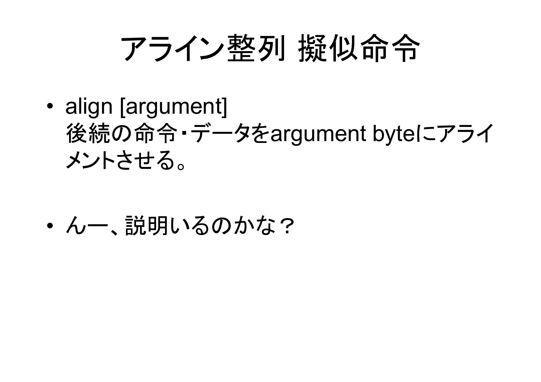 12 .altinstr_replacement 00000006 0804841c 0804841c 0000041c 2**0 CONTENTS, ALLOC, LOAD, READONLY, CODE 13 .fini 0000001a 08048424 08048424 00000424 2**2 CONTENTS, ALLOC, LOAD, READONLY, CODE 14 .rodata 00000008 08048440 08048440 00000440 2**2 CONTENTS, ALLOC, LOAD, READONLY, DATA 15 .altinstructions 00000017 08048448 08048448 00000448 2**2 CONTENTS, ALLOC, LOAD, READONLY, DATA さっきの、なんちゃって main.c をコンパイルして objdump a.out 中でのセクションのファイルオフセットとサイズが分かるので・・・