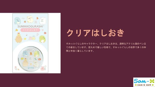 San-Xの「クリアはしおき(すみっコぐらし・B)」は、すみっコぐらしの人気キャラクターたちがデザインされた透明な箸置きです。この商品は、テーブルコーディネートを彩る可愛らしいアイテムで、キャラクターごとに異なるデザインが魅力的です。クリア素材で作られており、どんな食卓にも合いやすいシンプルかつ上品なデザインが特徴です。すみっコぐらしファンにはたまらない、毎日の食事を楽しくしてくれるアイテムです。コンパクトで使いやすく、プレゼントやコレクションにも最適です。