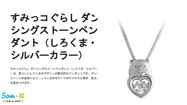 サンエックスの「すみっコぐらし ダンシングストーンペンダント(しろくま・シルバーカラー)」は、人気キャラクター「しろくま」をモチーフにしたエレガントなジュエリーです。ペンダントの中央に配置されたストーンは、微細な動きに反応して揺れ続ける「ダンシングストーン」デザインを採用。これにより、光を受けてキラキラと輝き、視線を引きつけます。シルバーカラーの金属部分は、シンプルでありながら洗練された印象を与え、普段使いから特別なシーンまで幅広く活用可能。ファン必見の可愛らしさと高級感を兼ね備えたペンダントです。
