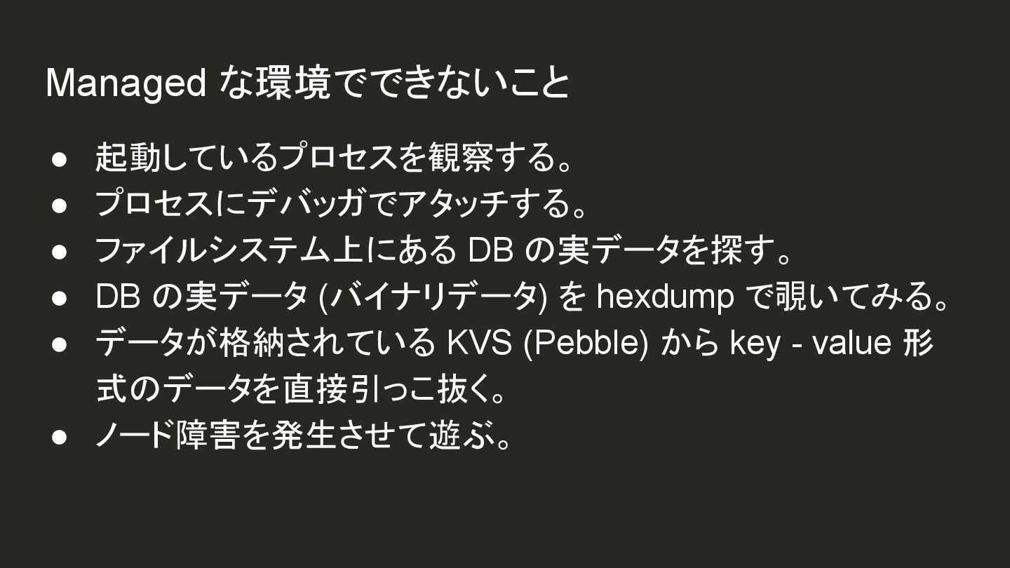• DB の実データ (バイナリデータ) を hexdump で覗いてみる。 • データが格納されている KVS (Pebble) から key - value 形 式のデータを直接引っこ抜く。 • ノード障害を発生させて遊ぶ。