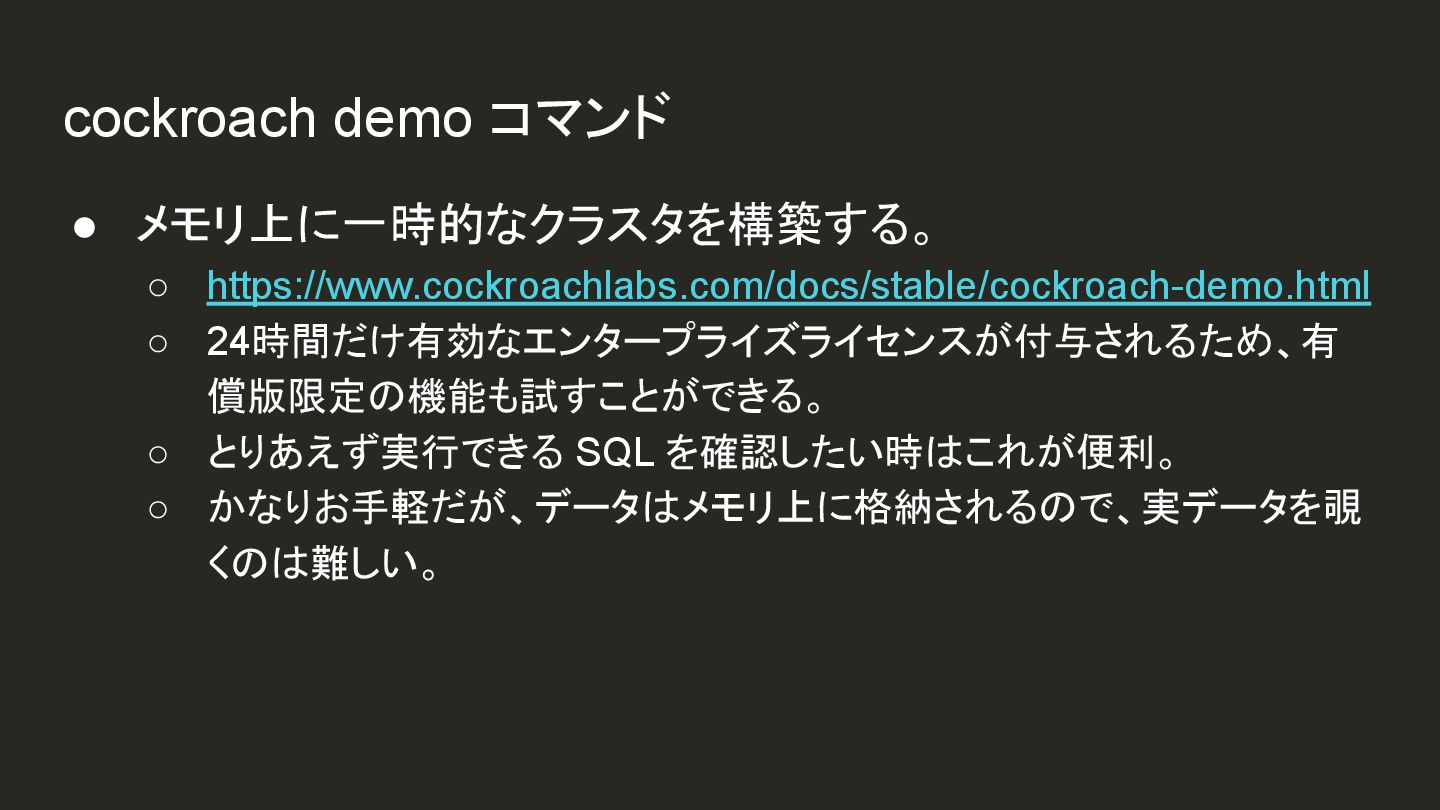 cockroach demo コマンド • メモリ上に一時的なクラスタを構築する。 ◦ https://www.cockroachlabs.com/docs/stable/cockroach-demo.html ◦ 24時間だけ有効なエンタープライズライセンスが付与されるため、有 償版限定の機能も試すことができる。