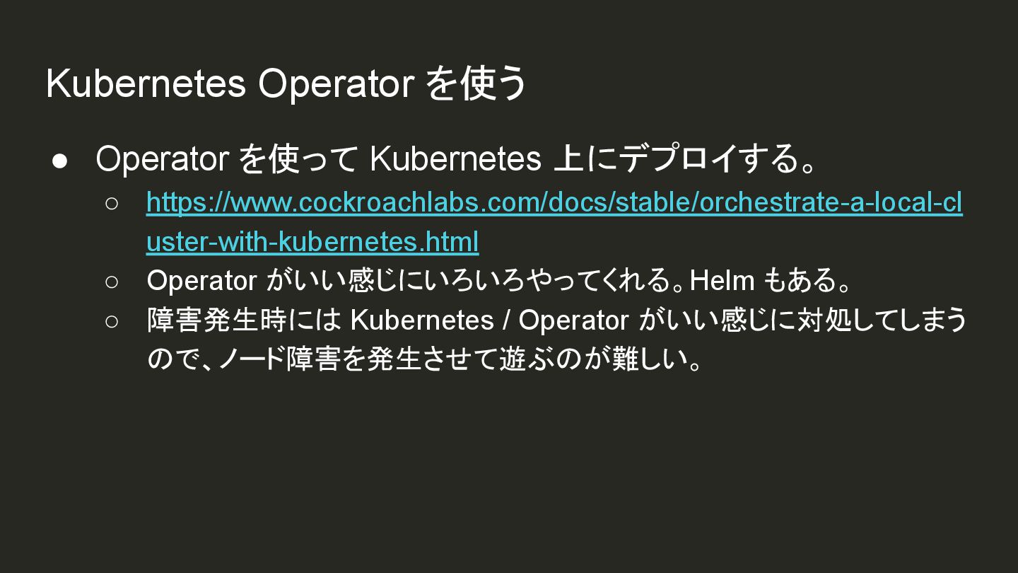 Kubernetes Operator を使う • Operator を使って Kubernetes 上にデプロイする。 ◦ https://www.cockroachlabs.com/docs/stable/orchestrate-a-local-cl