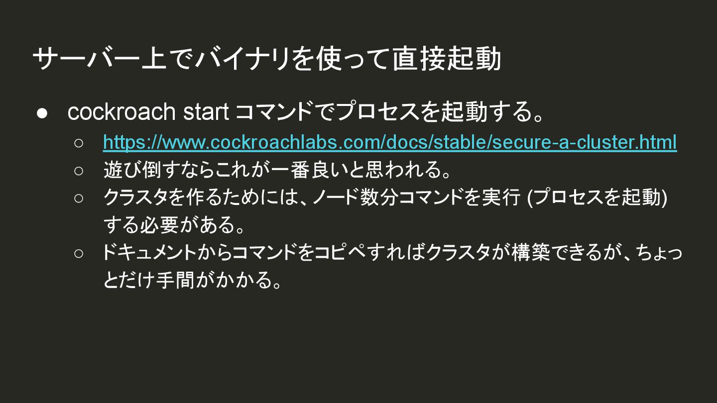 サーバー上でバイナリを使って直接起動 • cockroach start コマンドでプロセスを起動する。 ◦ https://www.cockroachlabs.com/docs/stable/secure-a-cluster.html ◦ 遊び倒すならこれが一番良いと思われる。 ◦