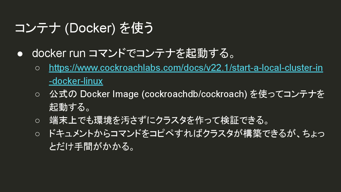 ◦ 公式の Docker Image (cockroachdb/cockroach) を使ってコンテナを 起動する。 ◦ 端末上でも環境を汚さずにクラスタを作って検証できる。 ◦ ドキュメントからコマンドをコピペすればクラスタが構築できるが、ちょっ とだけ手間がかかる。