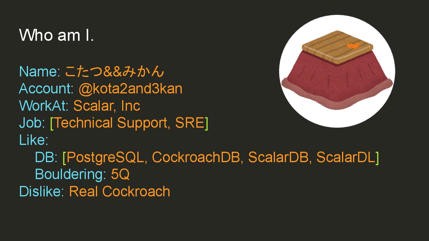 Who am I. Name: こたつ&&みかん Account: @kota2and3kan WorkAt: Scalar, Inc