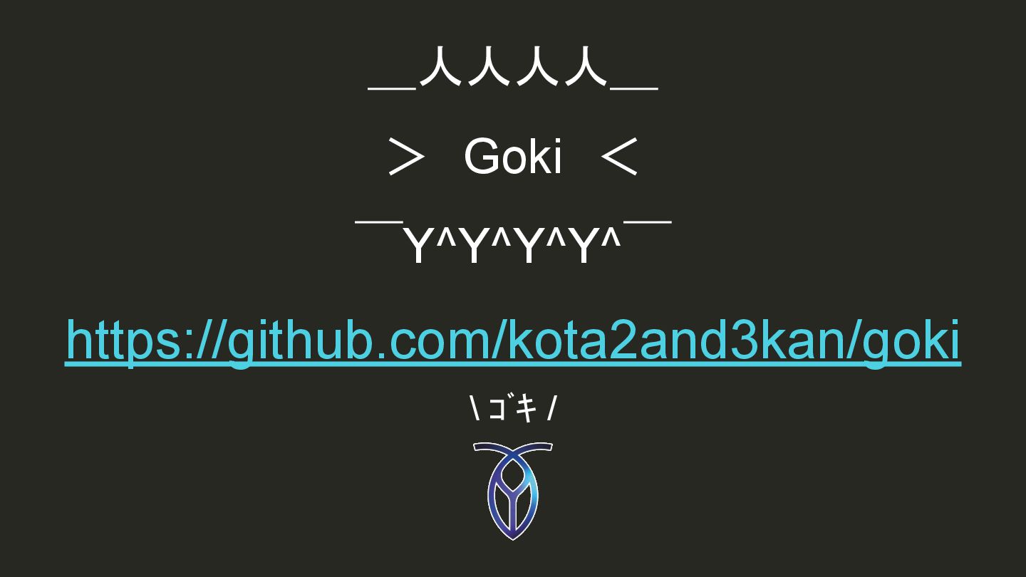 _人人人人_ > Goki <  ̄Y^Y^Y^Y^ ̄ https://github.com/kota2and3kan/goki \ ゴキ /