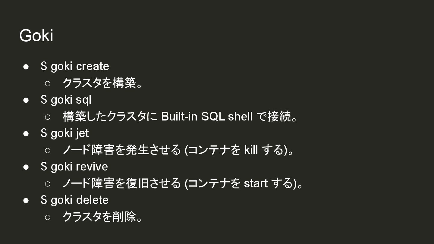 sql ◦ 構築したクラスタに Built-in SQL shell で接続。 • $ goki jet ◦ ノード障害を発生させる (コンテナを kill する)。 • $ goki revive ◦ ノード障害を復旧させる (コンテナを start する)。 • $ goki delete ◦ クラスタを削除。