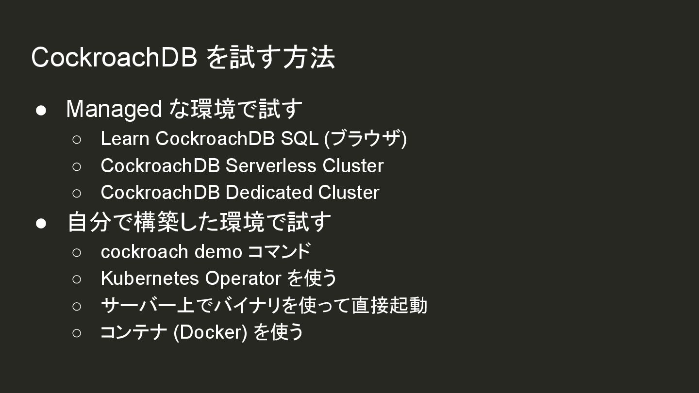 ◦ CockroachDB Serverless Cluster ◦ CockroachDB Dedicated Cluster • 自分で構築した環境で試す ◦ cockroach demo コマンド ◦ Kubernetes Operator を使う ◦ サーバー上でバイナリを使って直接起動 ◦ コンテナ (Docker) を使う