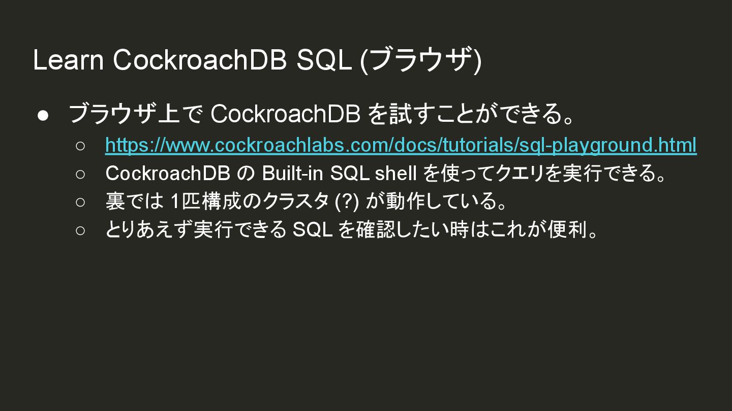 Learn CockroachDB SQL (ブラウザ) • ブラウザ上で CockroachDB を試すことができる。 ◦ https://www.cockroachlabs.com/docs/tutorials/sql-playground.html