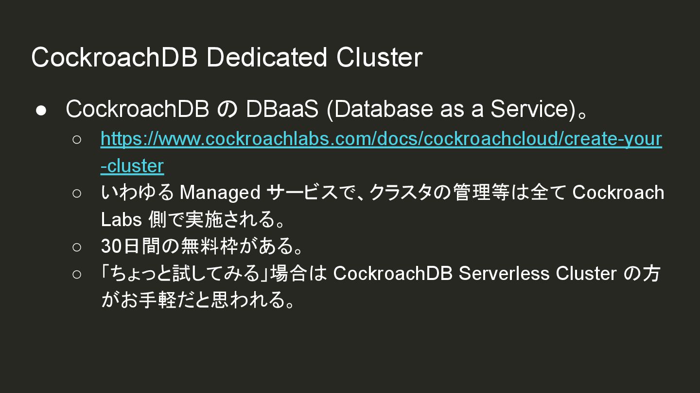 Service)。 ◦ https://www.cockroachlabs.com/docs/cockroachcloud/create-your -cluster ◦ いわゆる Managed サービスで、クラスタの管理等は全て Cockroach Labs 側で実施される。 ◦ 30日間の無料枠がある。 ◦ 「ちょっと試してみる」場合は CockroachDB Serverless Cluster の方 がお手軽だと思われる。