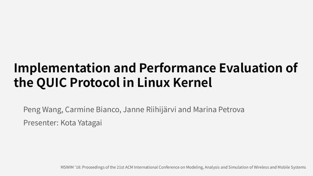 is designed to run in user space, making deployment quicker • QUIC also has TLS1.3 as its required subsystem, ensuring security ◦ QUIC-specific information such as initial CID is piggybacked in TLS handshake ◦ Whole QUIC handshake will be done with 1RTT at maximum • Prior studies compared user-space QUIC vs kernel-space TCP, which seemed unfair • This work implements QUIC inside the Linux kernel for a fair comparison against TCP