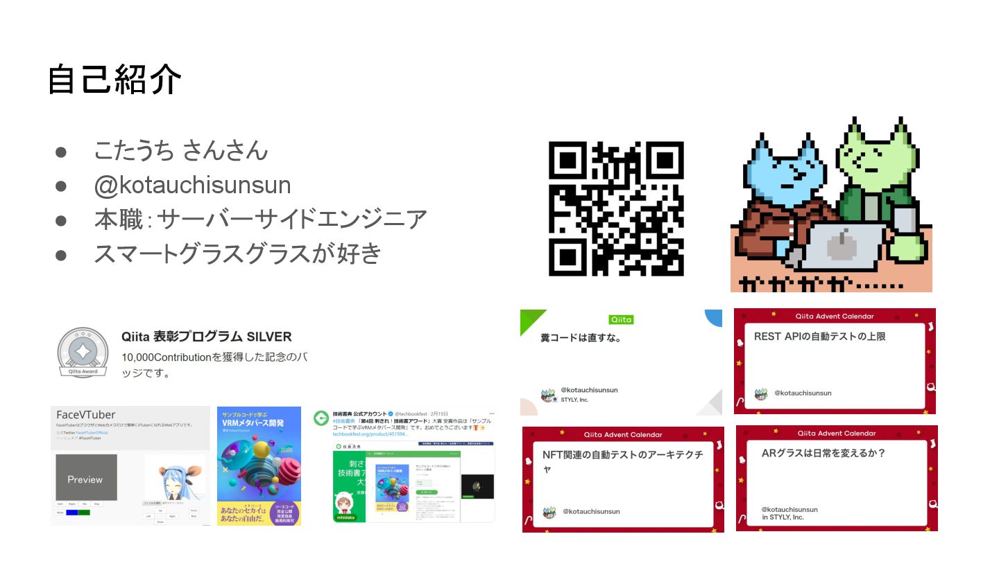 自己紹介 • こたうち さんさん • @kotauchisunsun • 本職:サーバーサイドエンジニア • スマートグラスグラスが好き