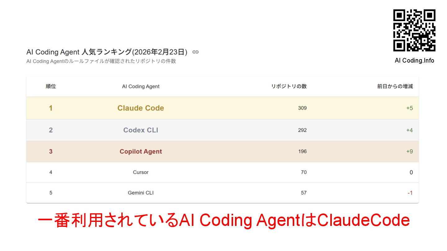 まとめ • 2026年2月23日の最新利用動向 ◦ 一番利用されている AI Coding AgentはClaude Code ◦